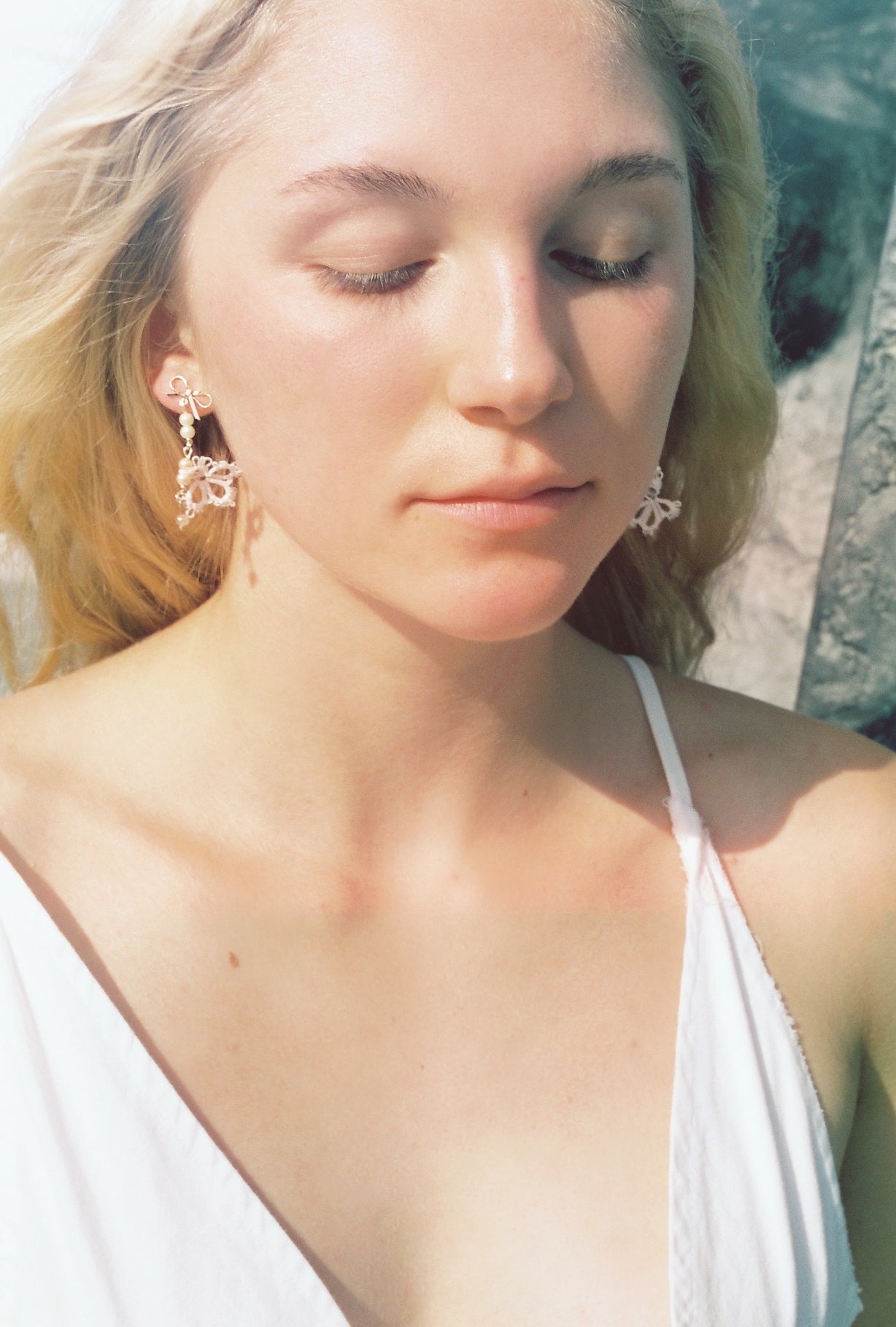 - Composition: 18K gold plated bow posts adorned with genuine ivory and peach natural toned pearls and antique hand tatted lace