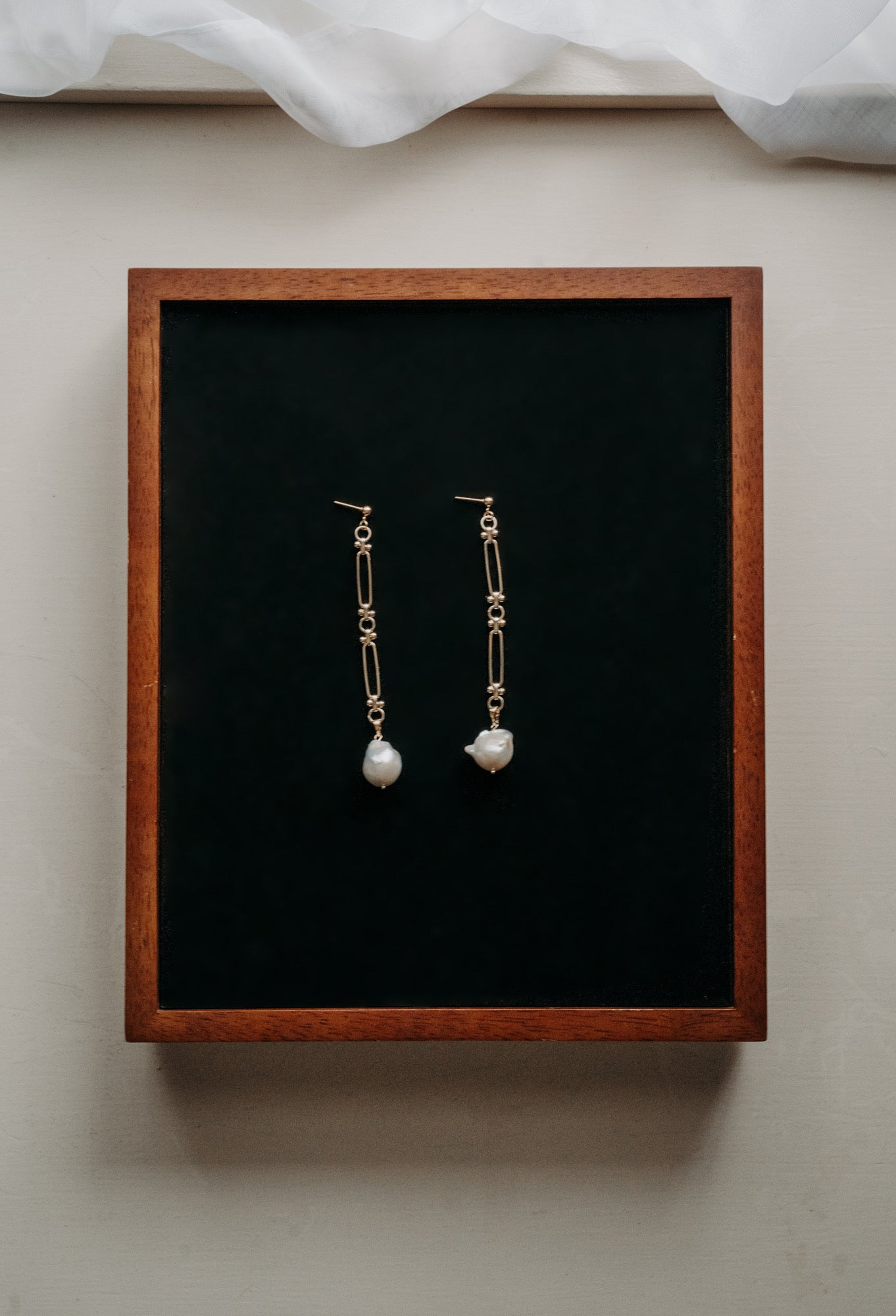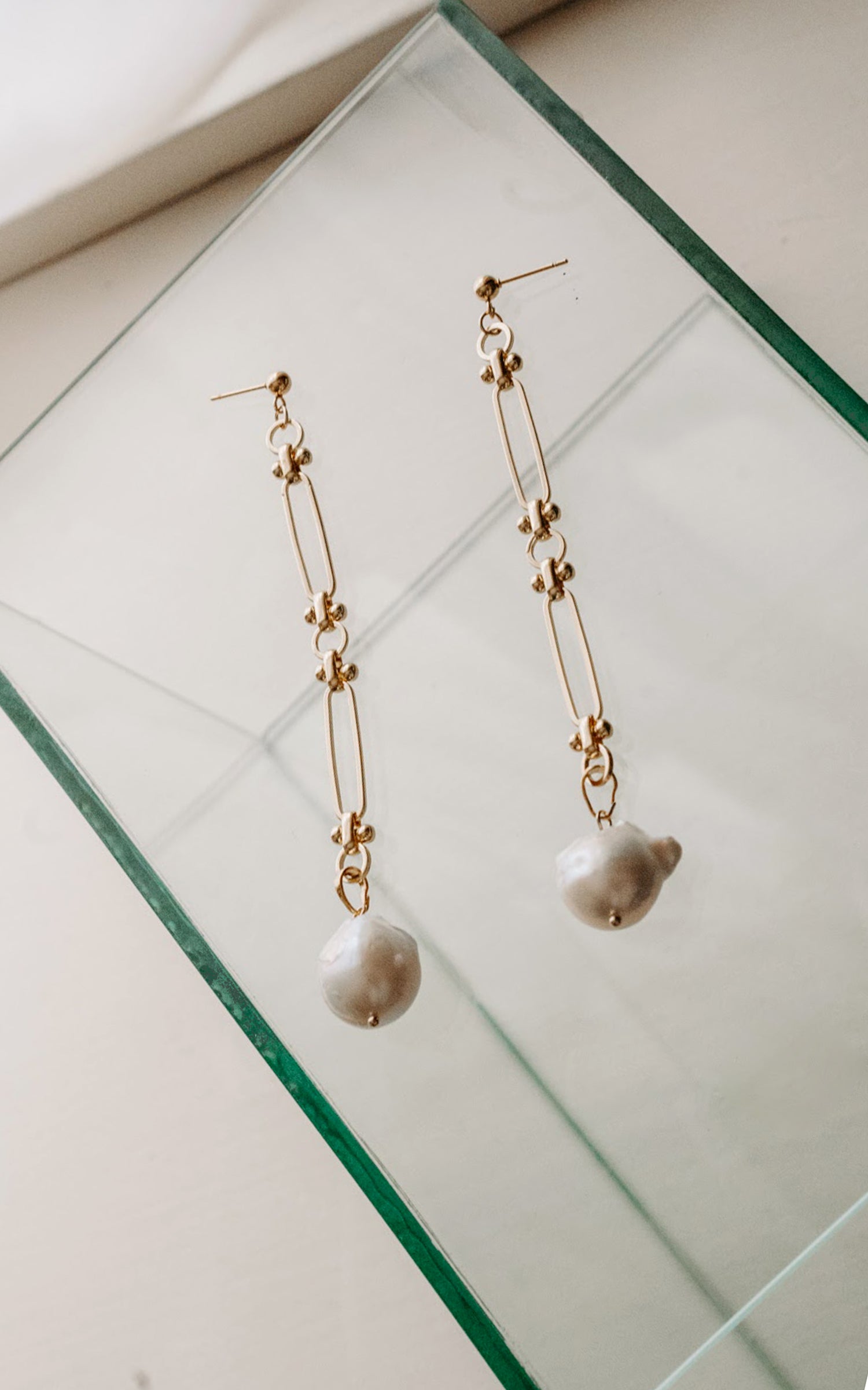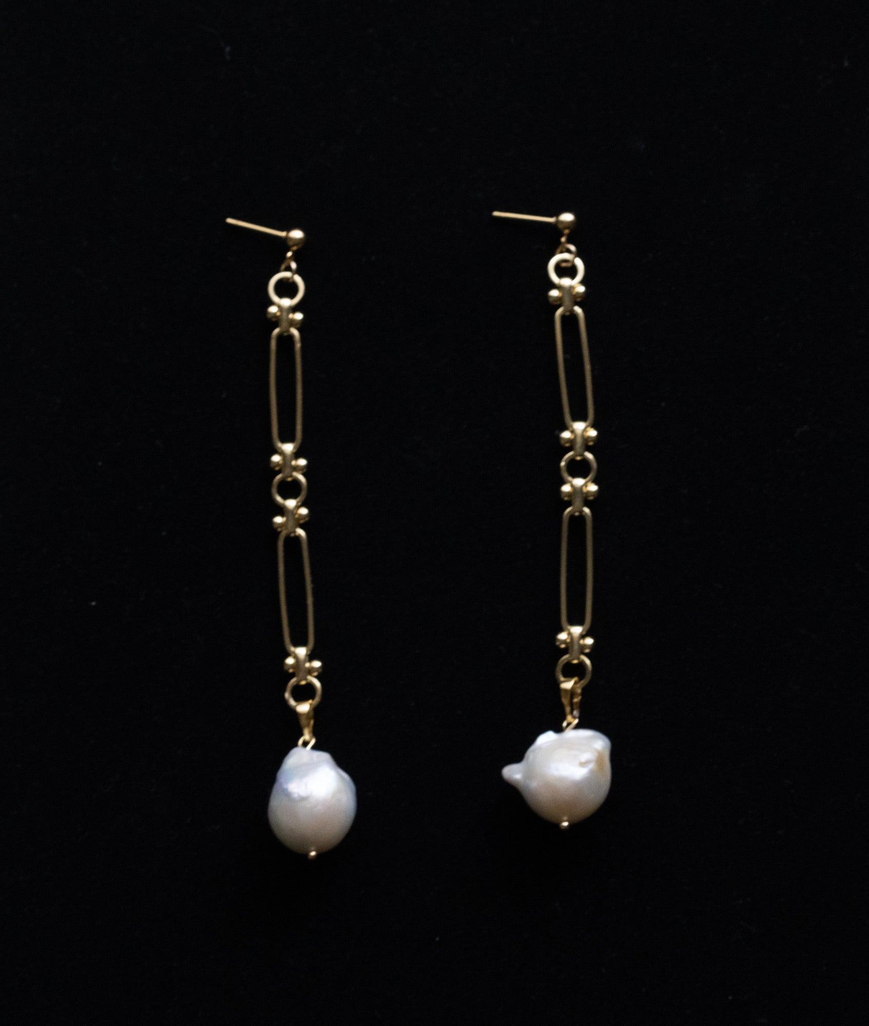 - Composition: Genuine Baroque Pearl Drops on your choice of either 24K plated or 14K Solid Gold Posts and a length of either 3" or 4". Pictured in 4" length.