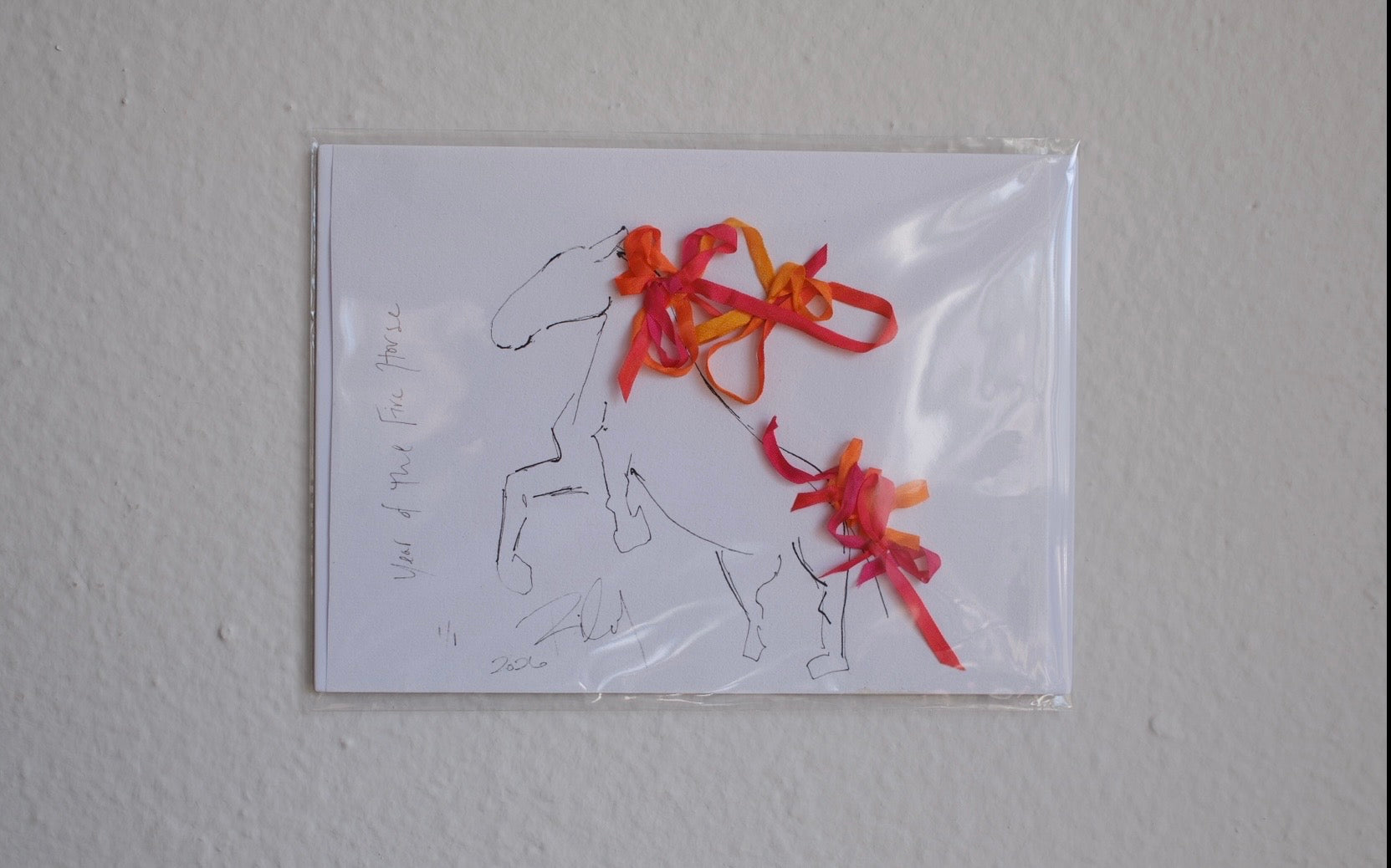 Minimal linework traces the spirited form of a horse in motion, while vivid ribbons in tones of crimson and flame weave through the composition, introducing texture, movement, and a sense of quiet intensity.