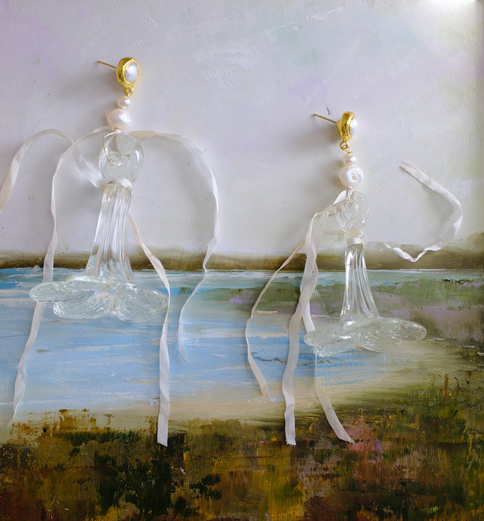 made with luxury materials. lustrous baroque pearl studs, freshwater pearl, and rare sparkling murano glass angel trumpet flowers softly wrapped in ivory silk ribbon on gold.
