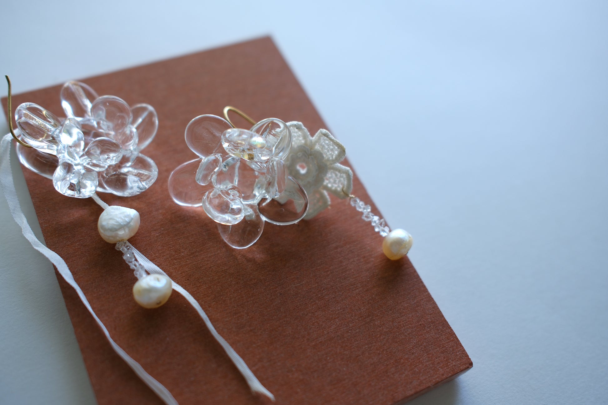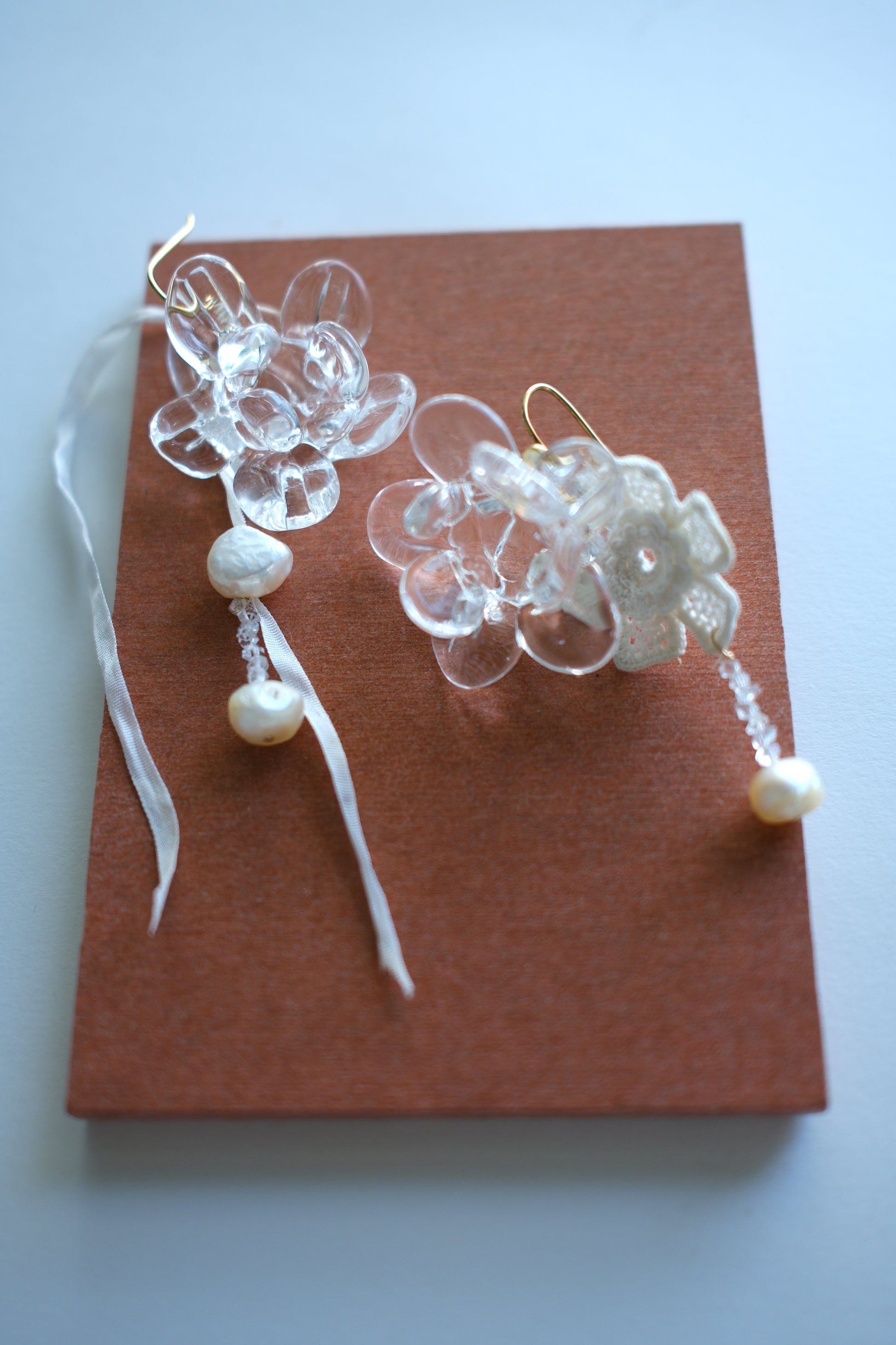 Artisan hand made glass blown flora sculptures on your choice of solid 14K gold, sterling silver or gold fill ear wire with natural freshwater pearl, genuine silk ribbon, raw crystal and rare crochet flora detail. Demi Bespoke.