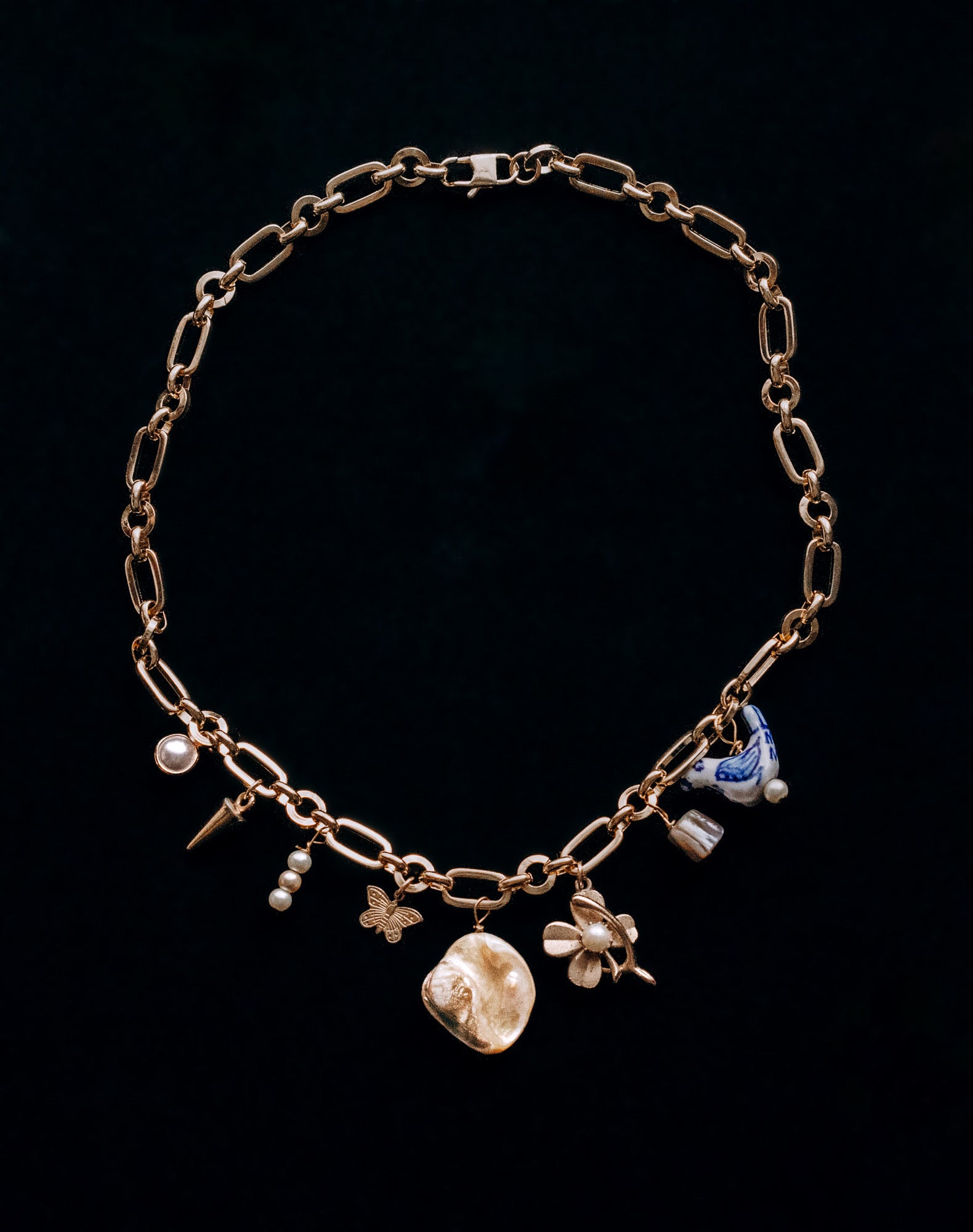 - Composition: Genuine 24K gold fill chain adorned with antique, vintage charms and dashes of genuine pearls