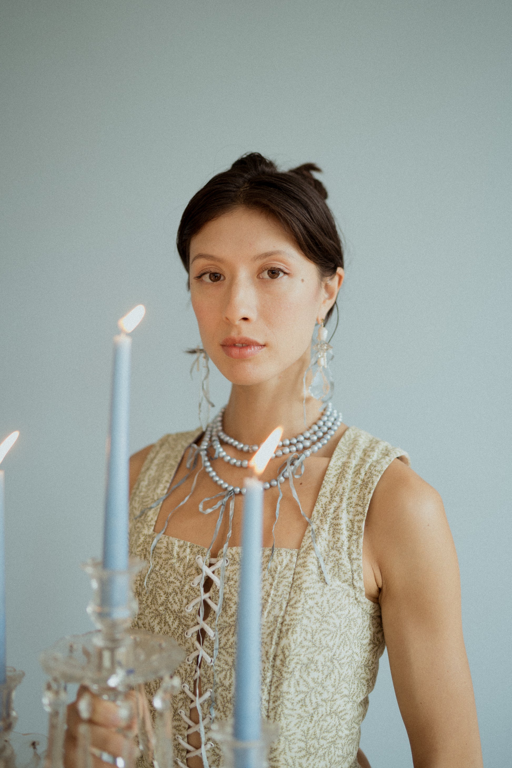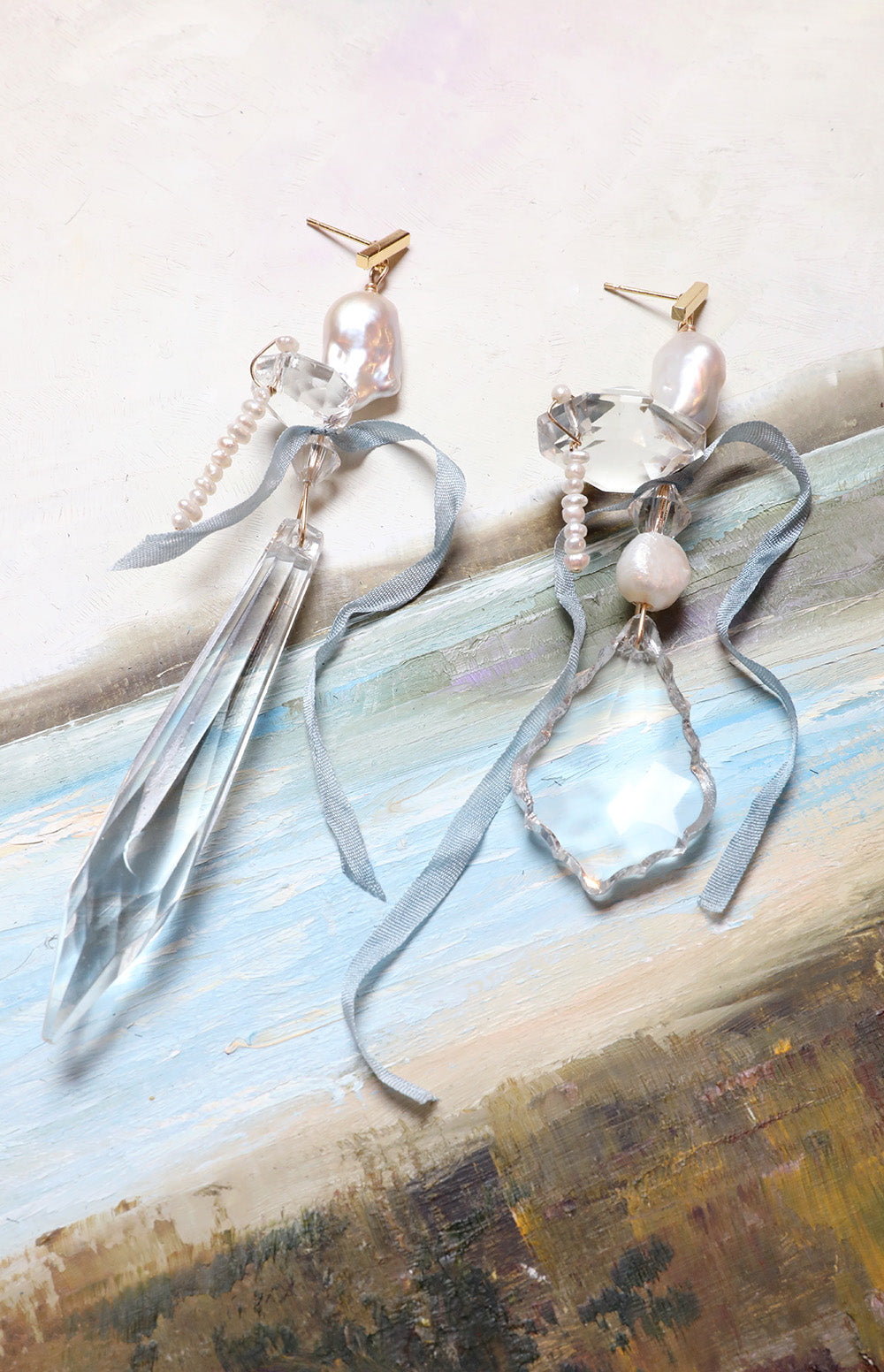 made with luxury materials. 2 rare lustrous baroque pearls on gold hold sparkling crystal and freshwater pearl softly wrapped in heirloom blue silken ribbon.