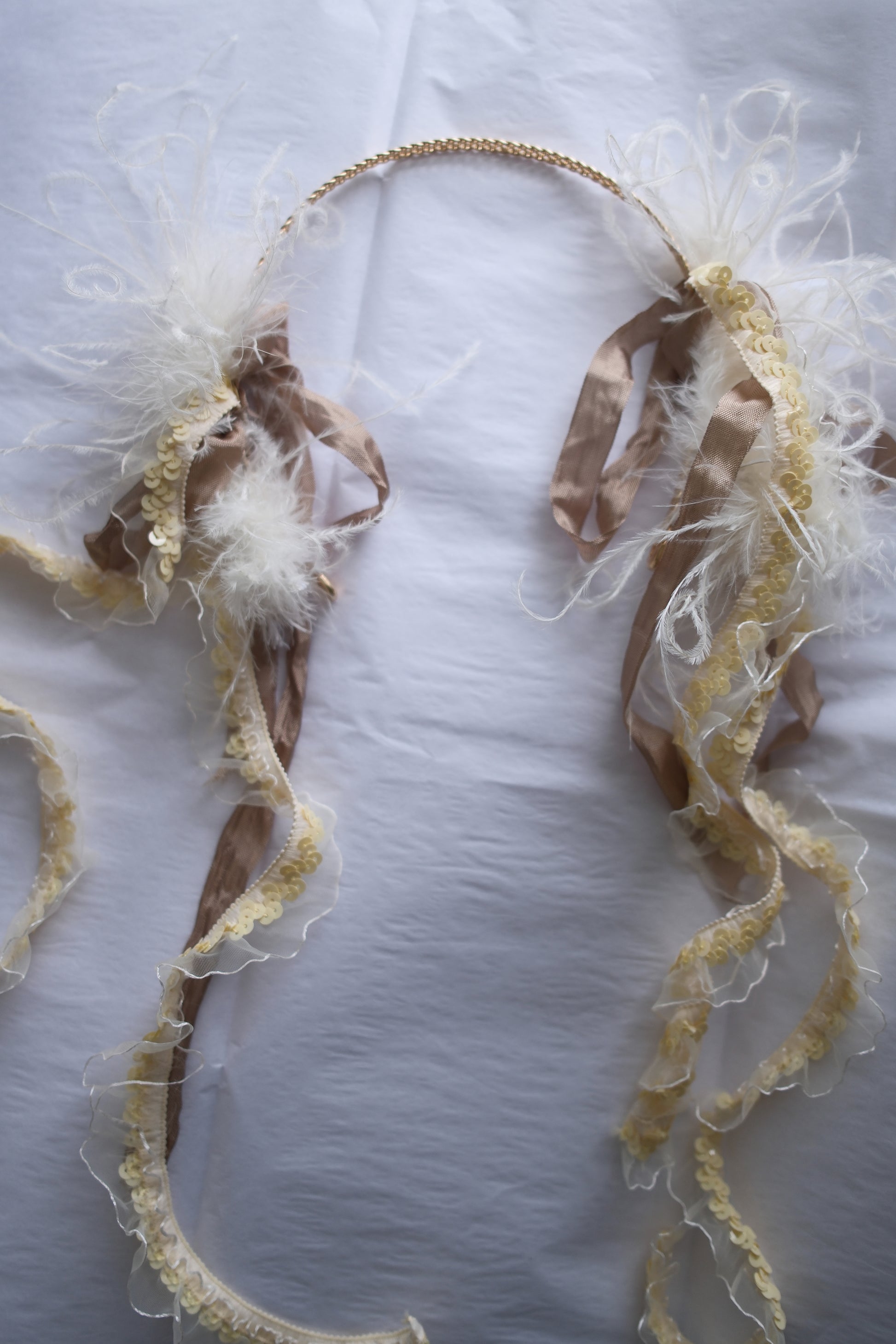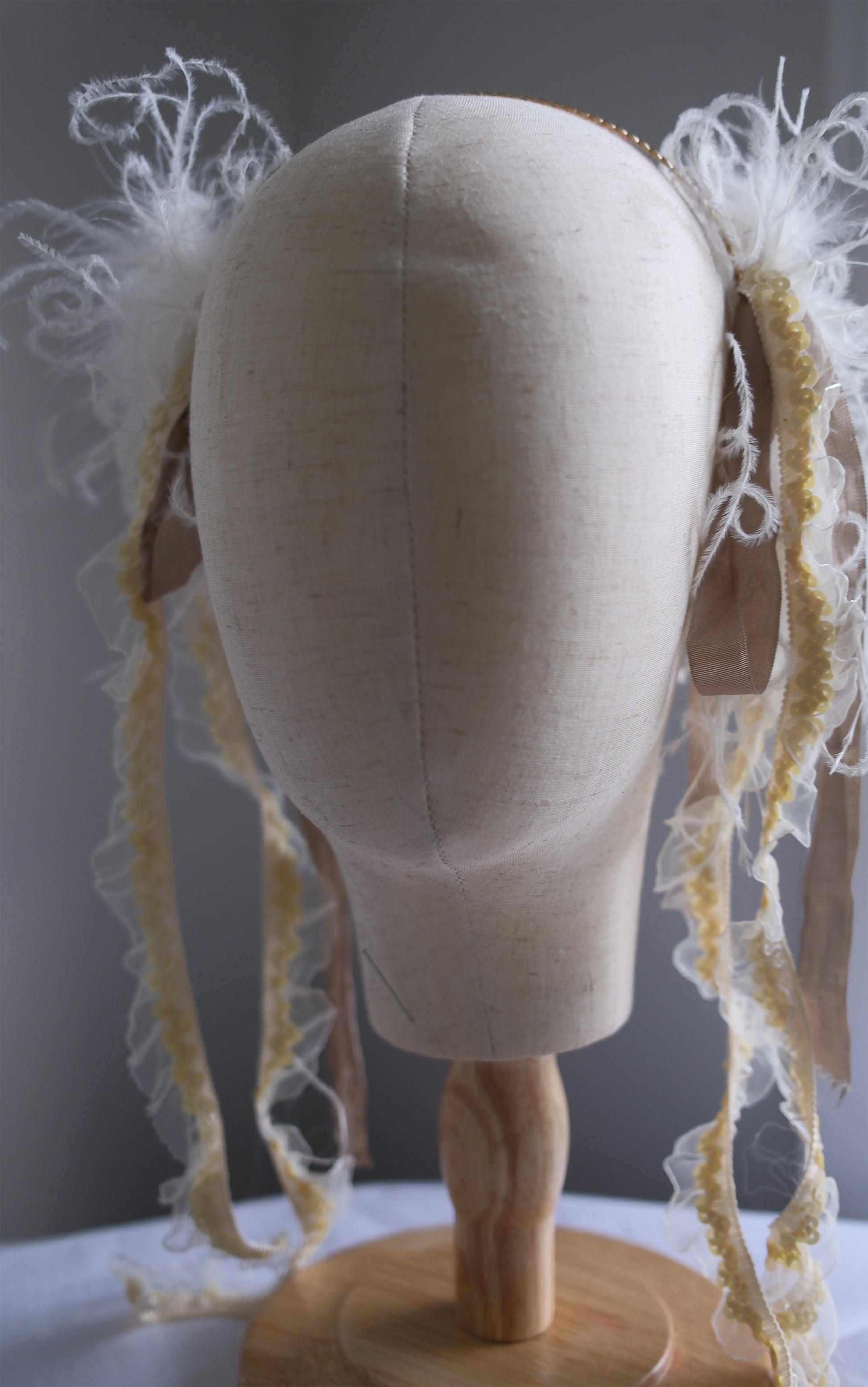 Inspired by 1800 adornments. Ivory Curly Ostrich Feather headpiece with antique taupe silk and vintage butter yellow ruffled sequin kisses.