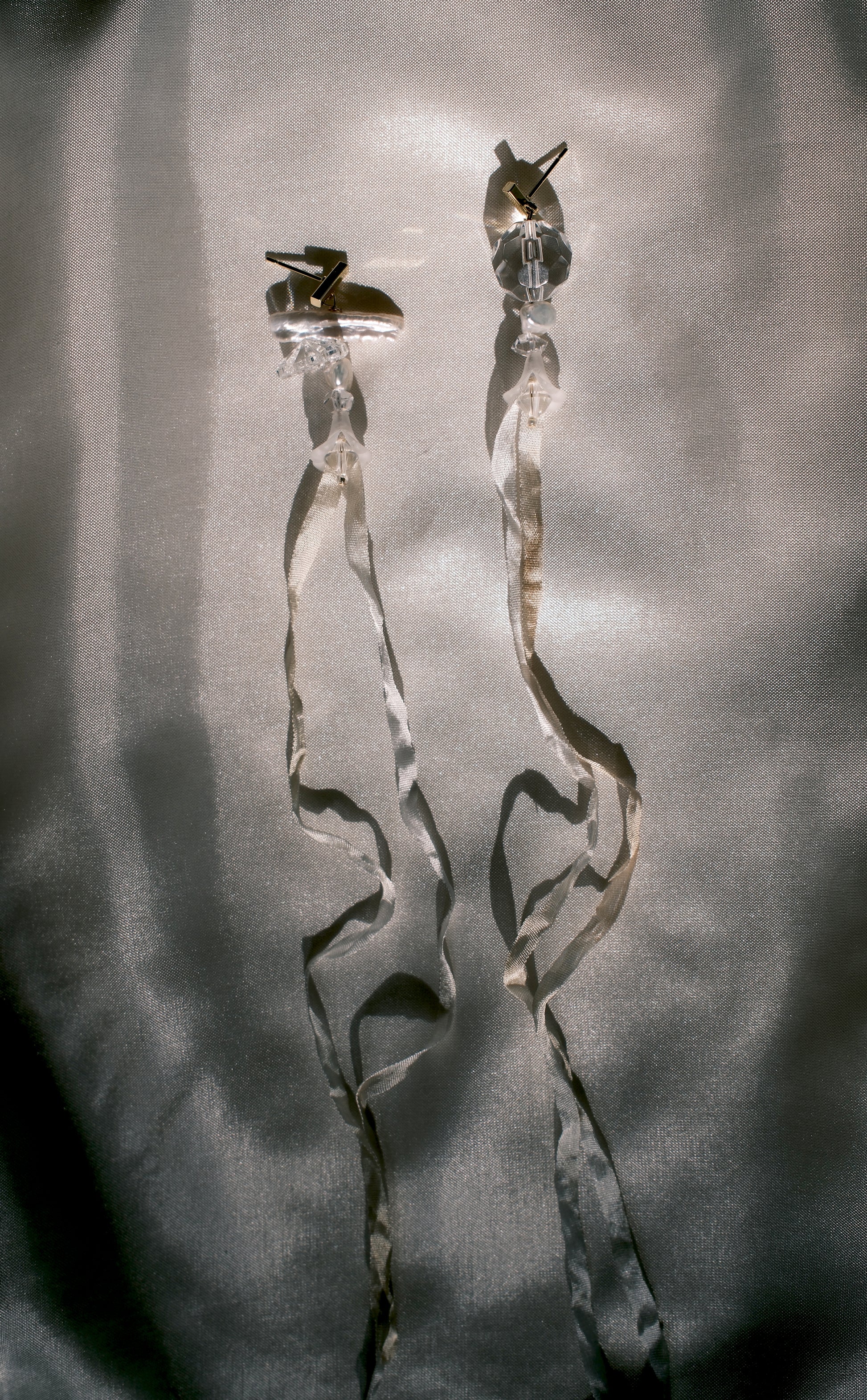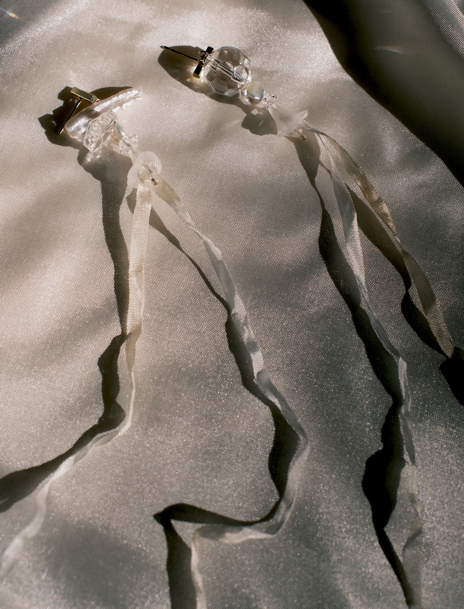 2 rare antique lucite flowers bloom from sparkling crystal and freshwater pearl with softly cascading silken ribbon.