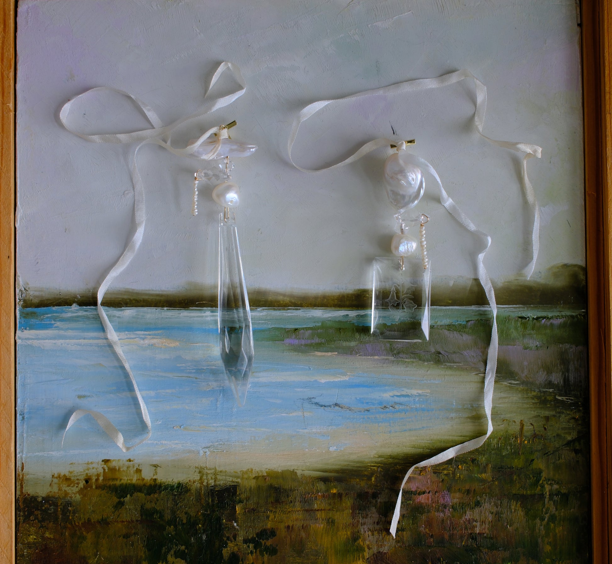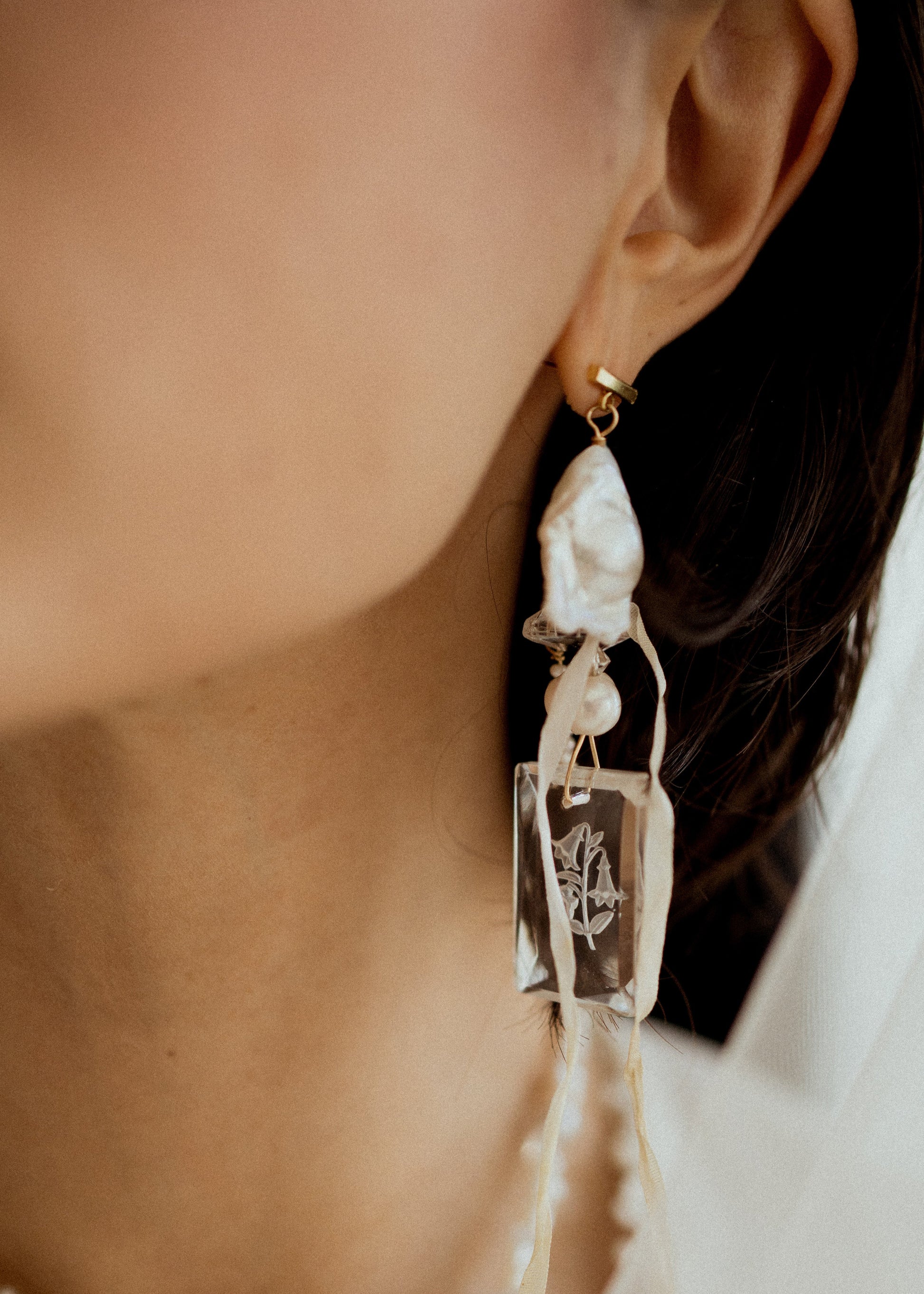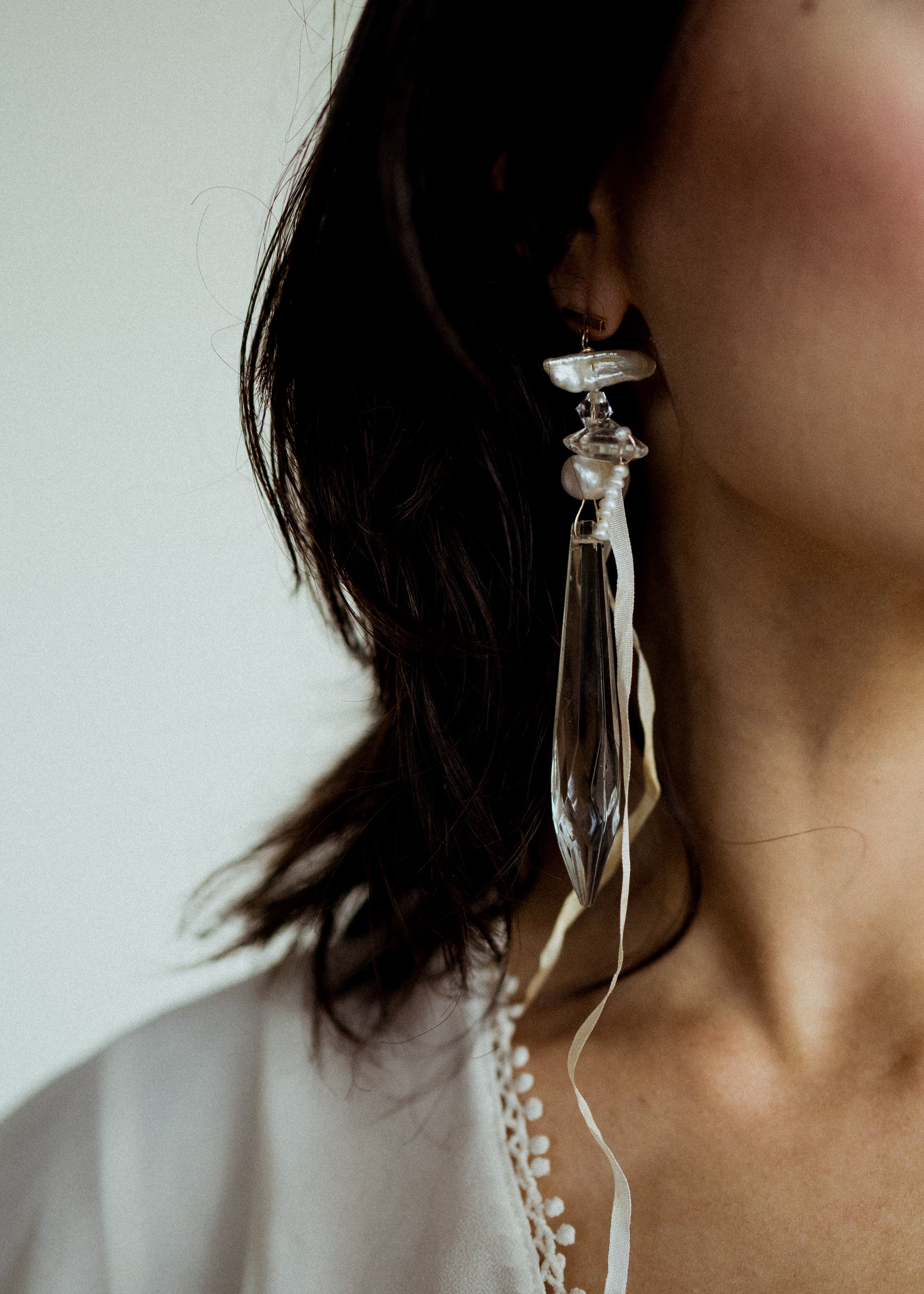 made with luxury materials. lustrous baroque pearl, freshwater Pearl, and sparkling crystal dance asymmetrically with rare antique glass etched florals softly wrapped in ivory silk ribbon on gold.