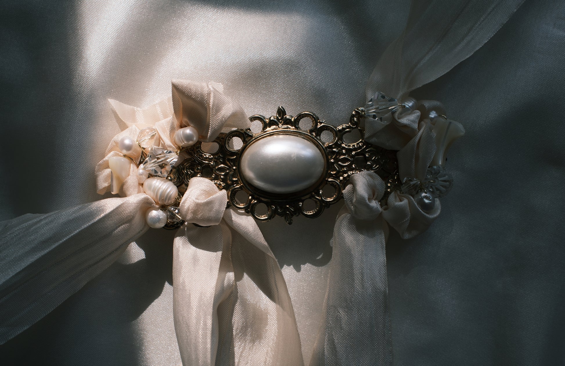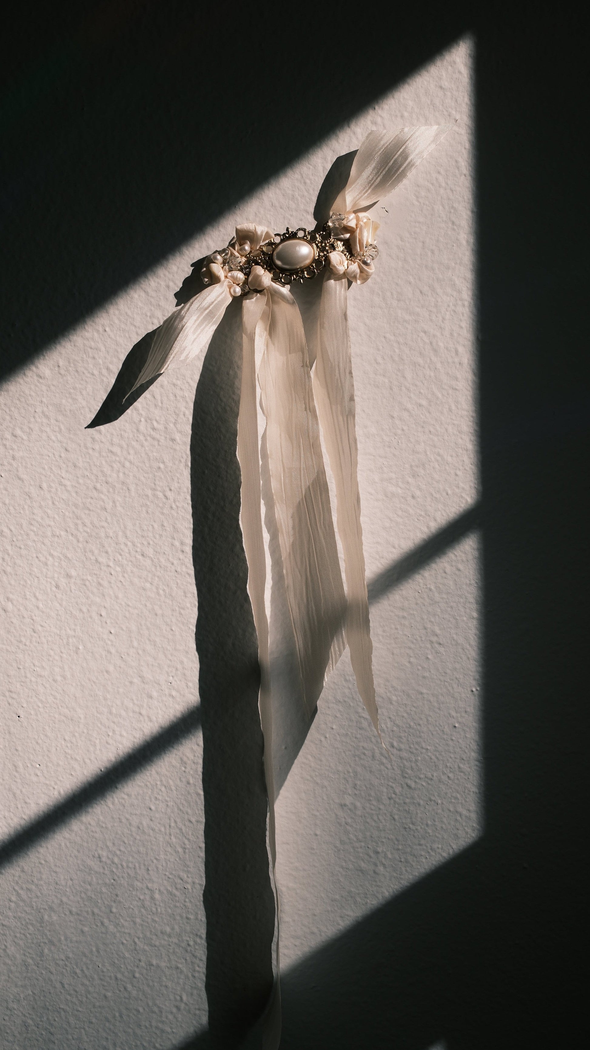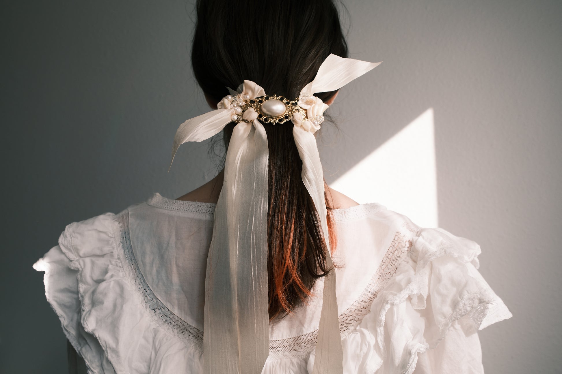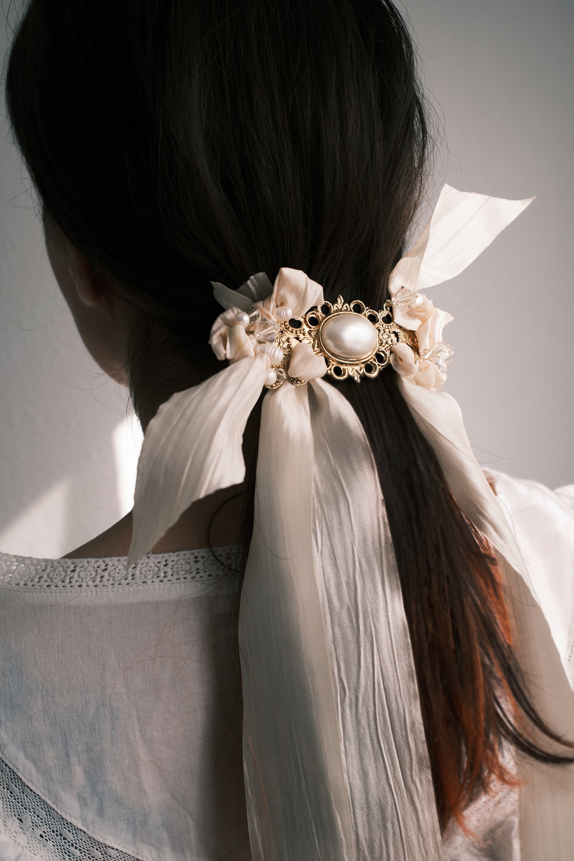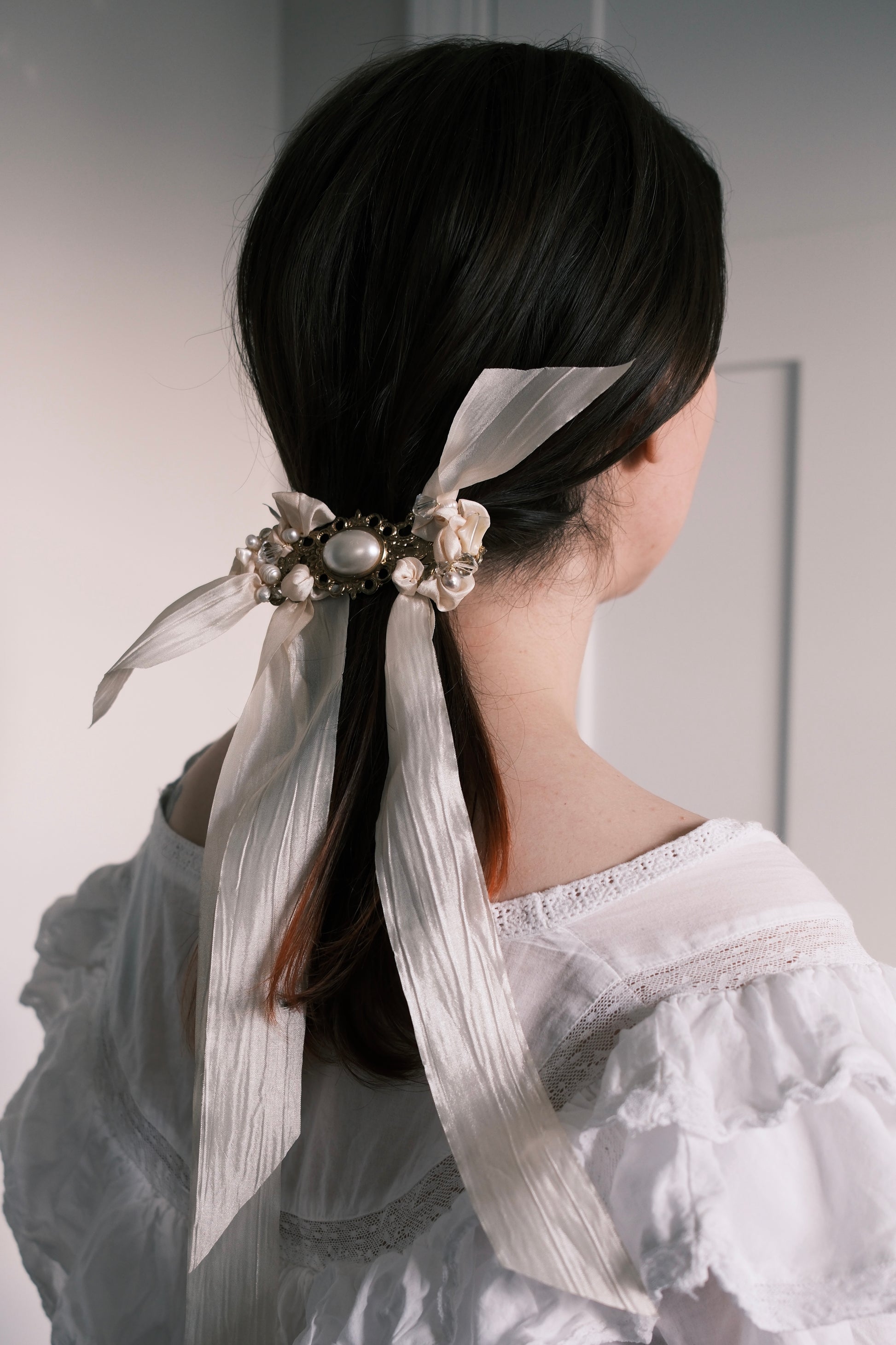 Ornate antique French hair piece embellished with ruched ribbon. freshwater pearl, vintage crystal, natural shell and adorned with bespoke angel like wings to kiss the back of the head