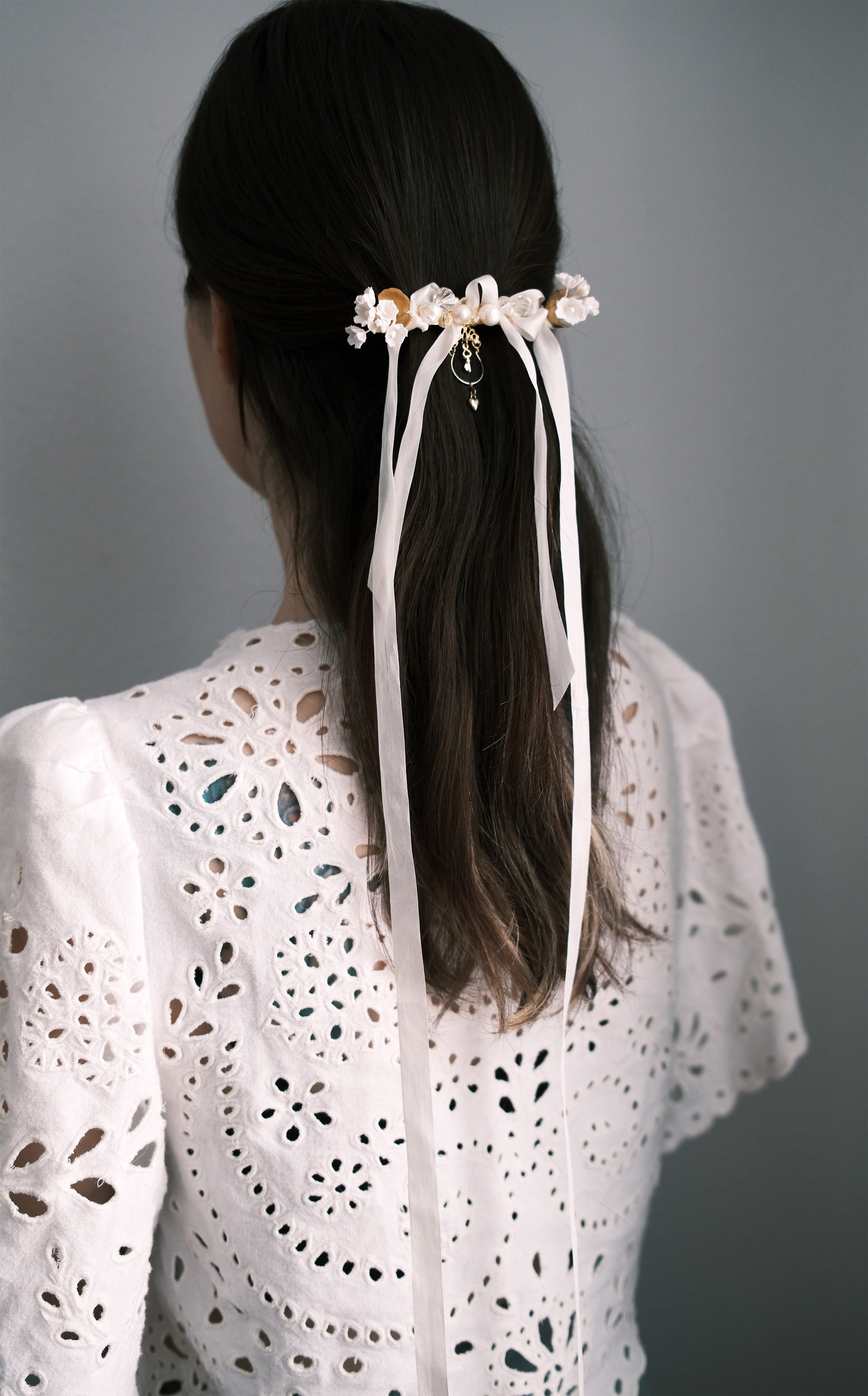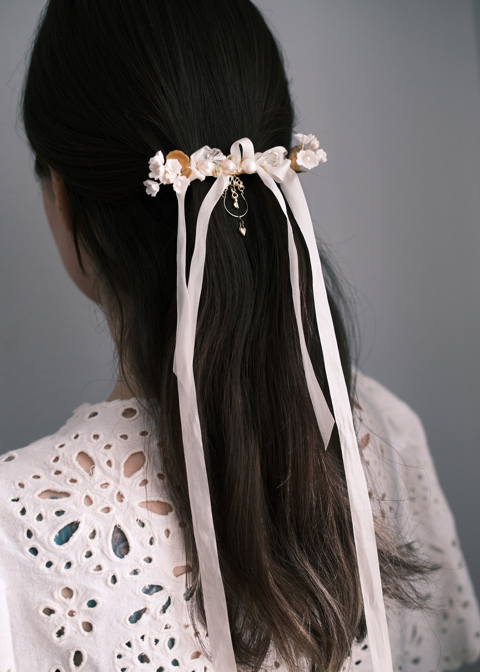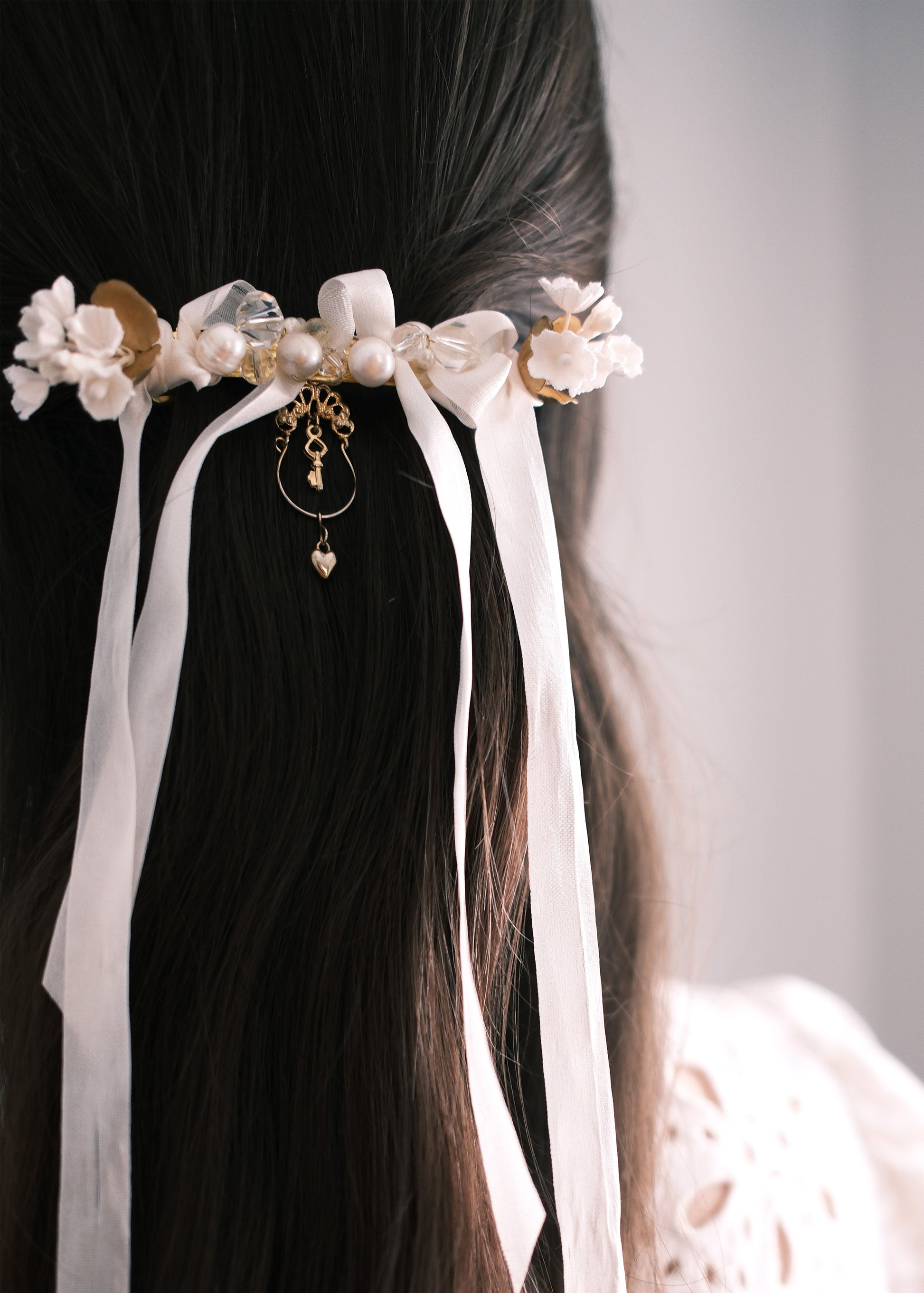 This ornate hair piece is embellished by hand with ruched silk ribbon, freshwater pearl, vintage crystal, and adorned with antique brass and fabric flora and vintage key to my heart charm to kiss the back of the head