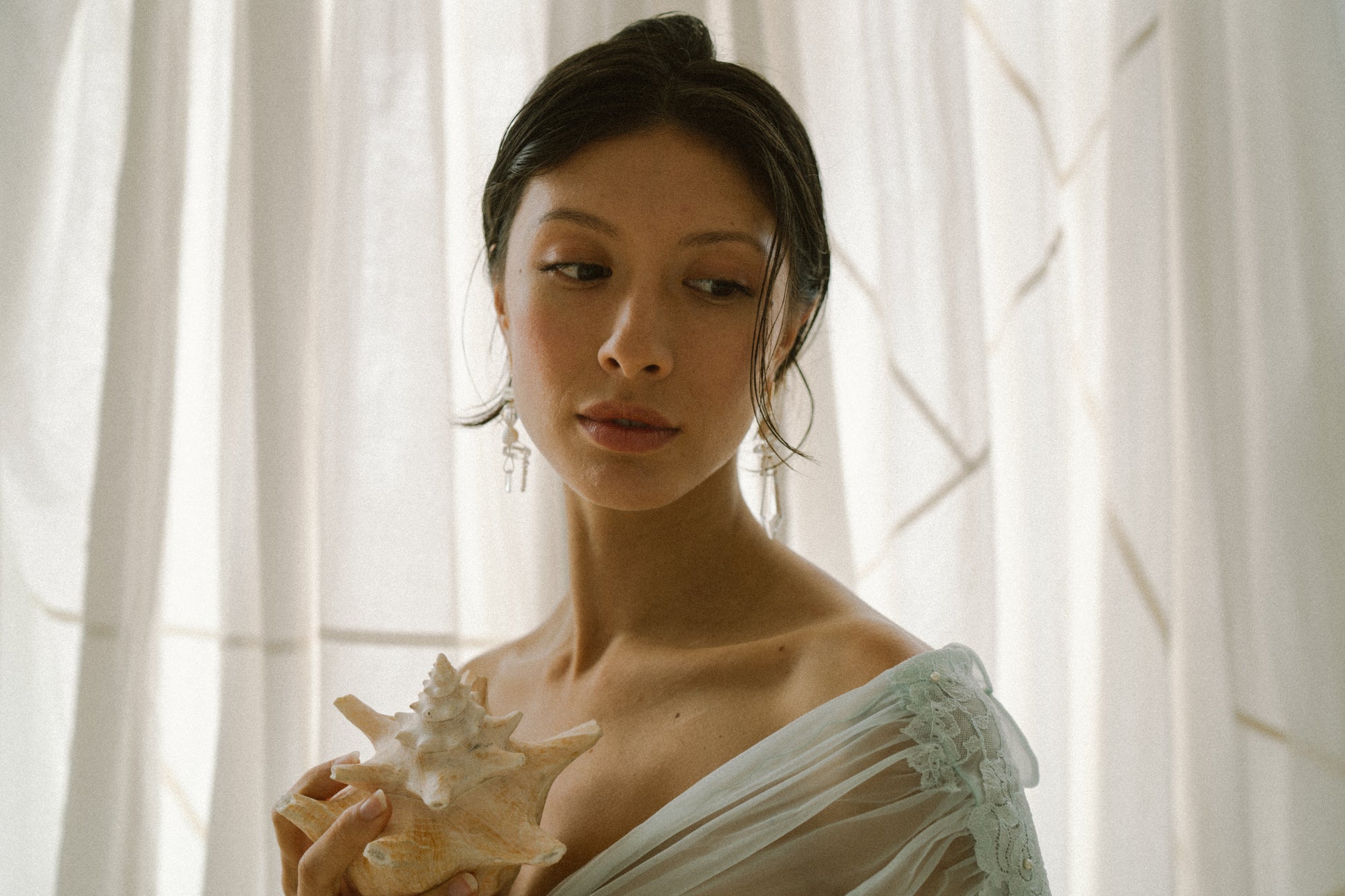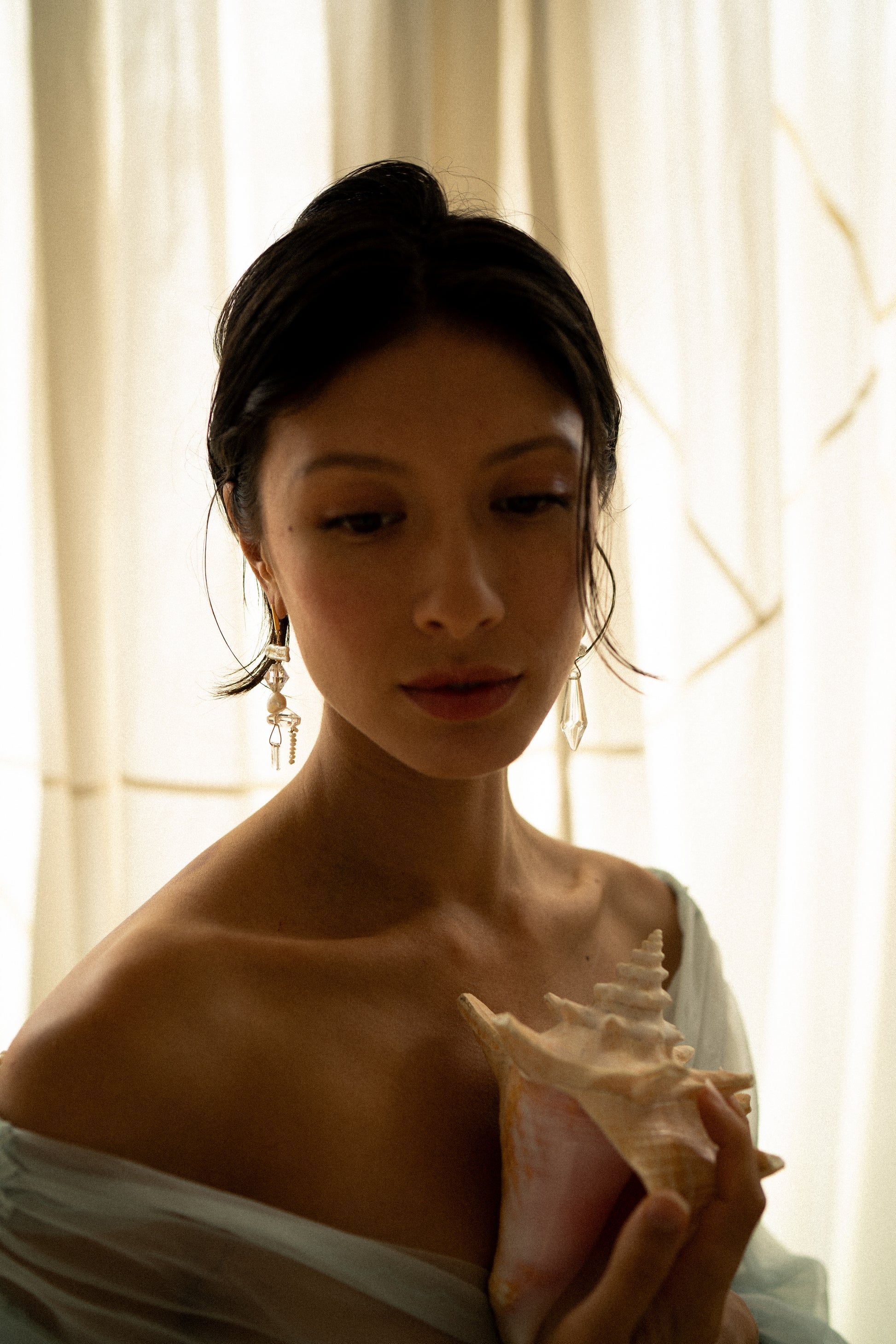 made with luxury materials. radiant freshwater pearl, and sparkling crystal dance asymmetrically on gold with artisanal antique etched florals in glass.