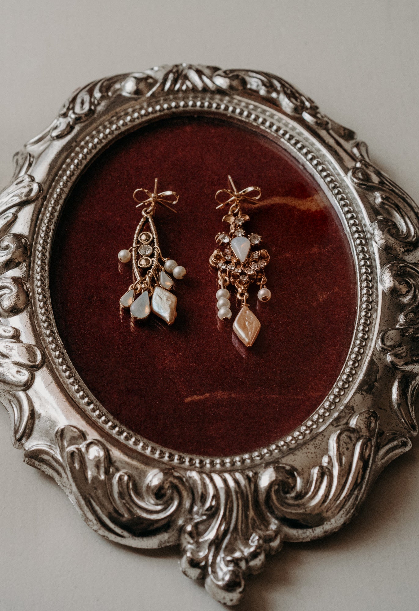 These reimagined regal antique forms now rest on dainty gold bows amongst opal charms and a plethera of pearl. Romans believed the opal stone was the most precious and powerful gem. A symbol of love, hope, purity, and truth.