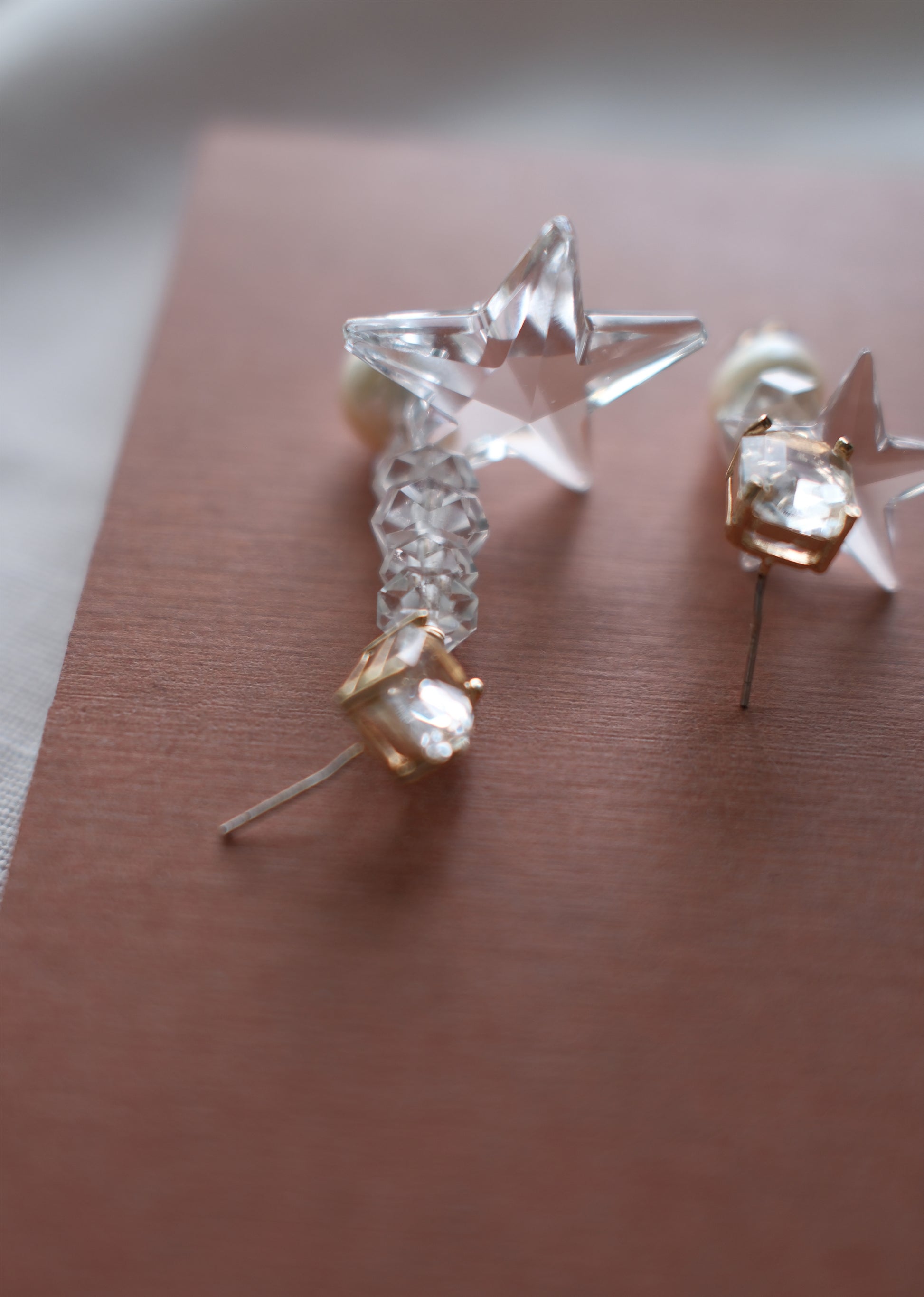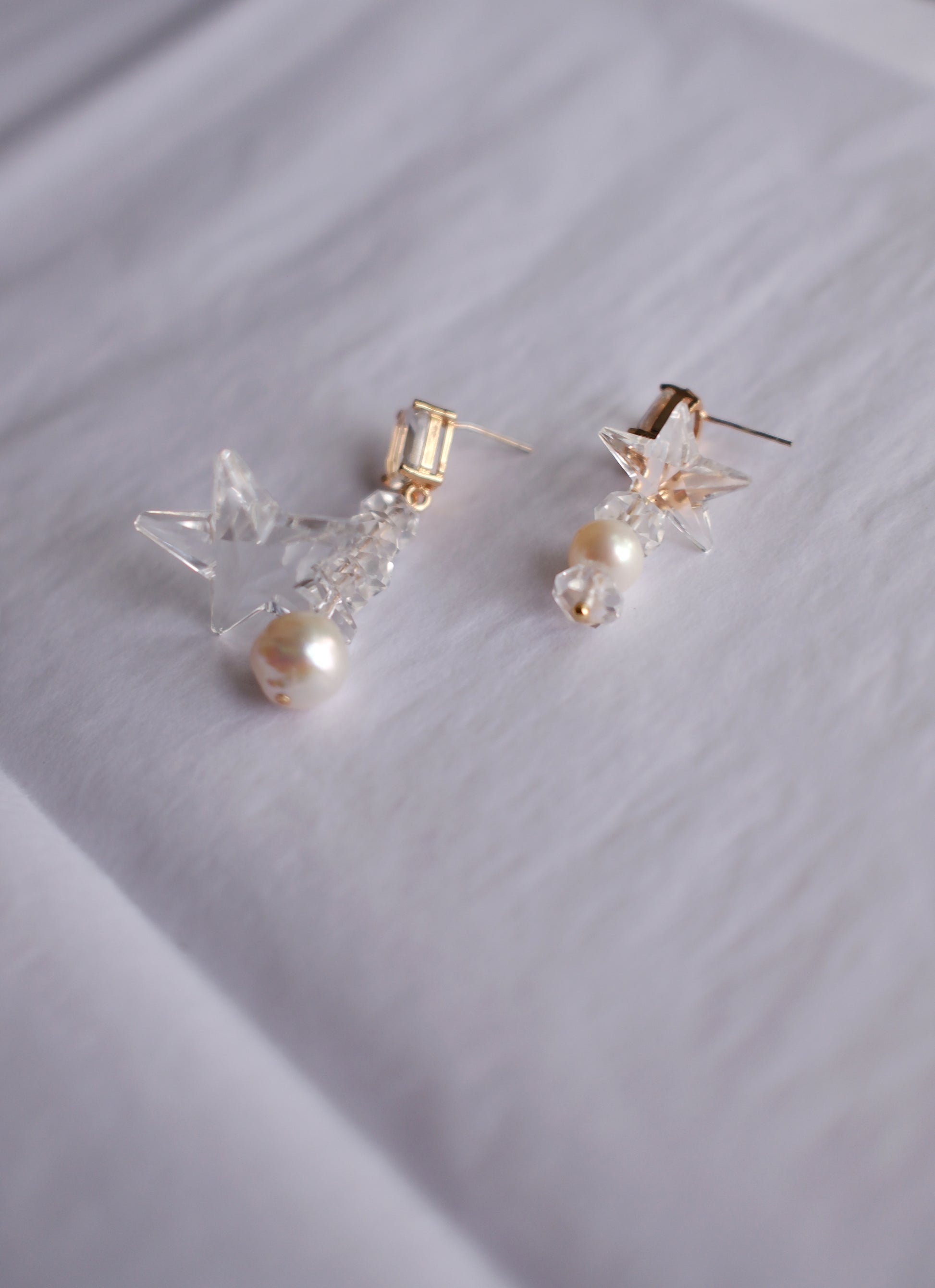 Genuine freshwater pearls and asymmetrical sparkling crystal stars hang from antique crystal orbs on 18k Gold Plated Glass, brass earrings with 925 sterling silver earring posts.