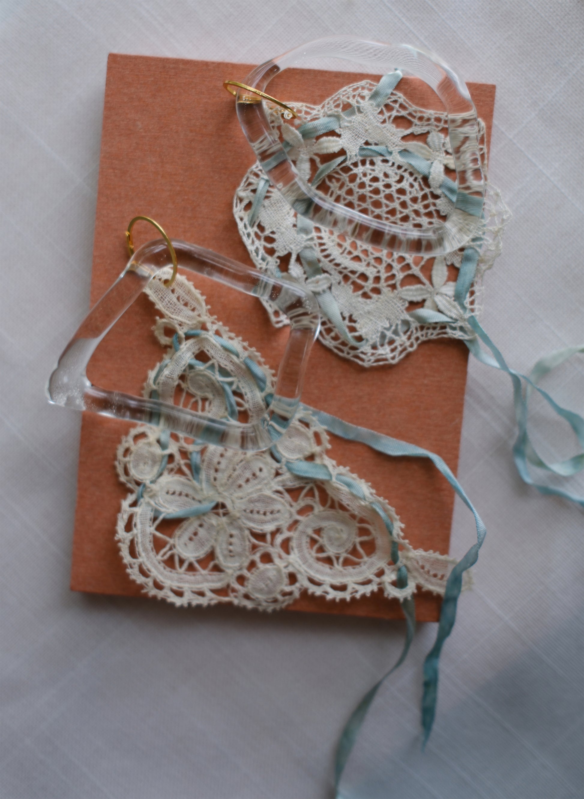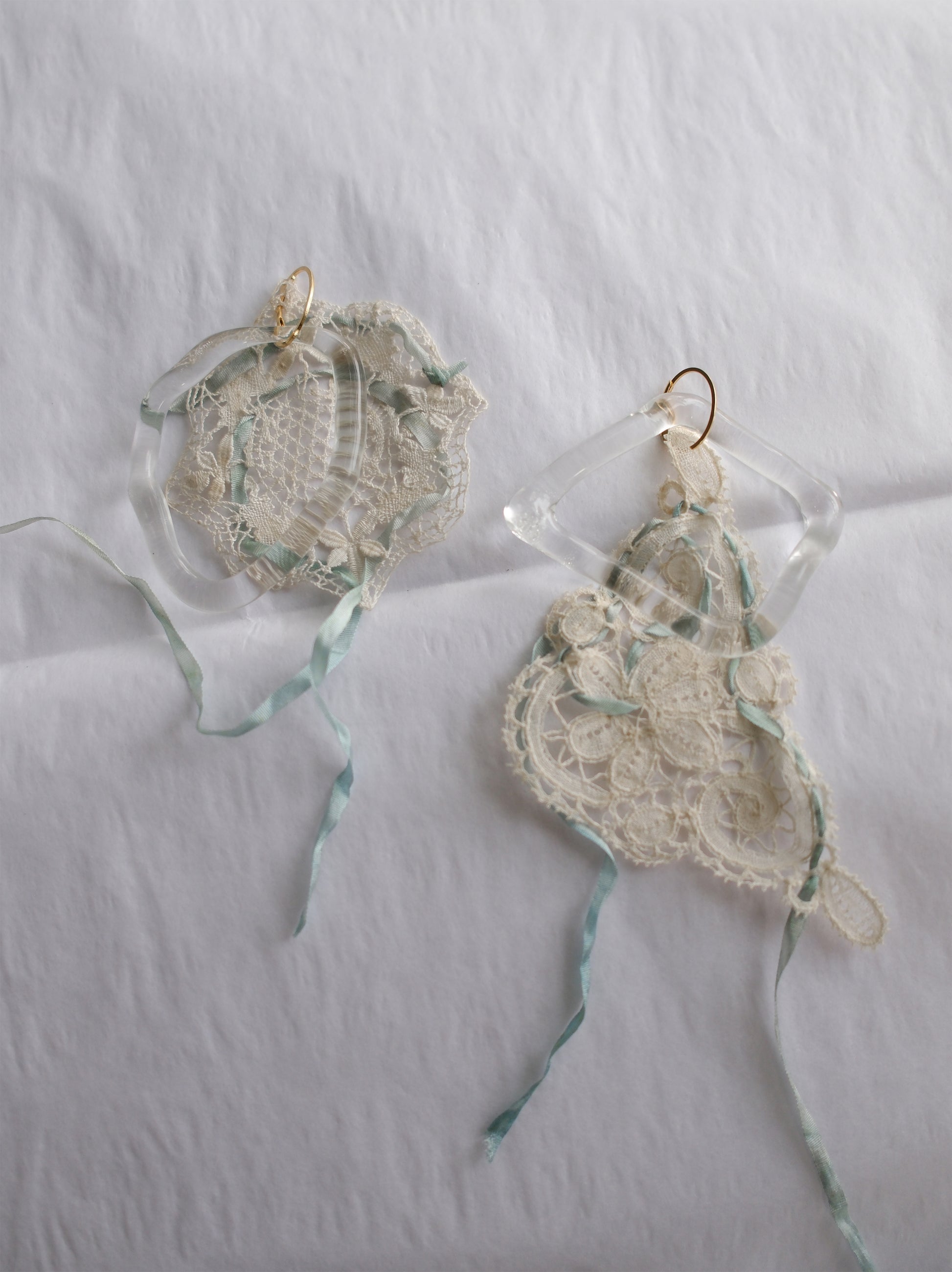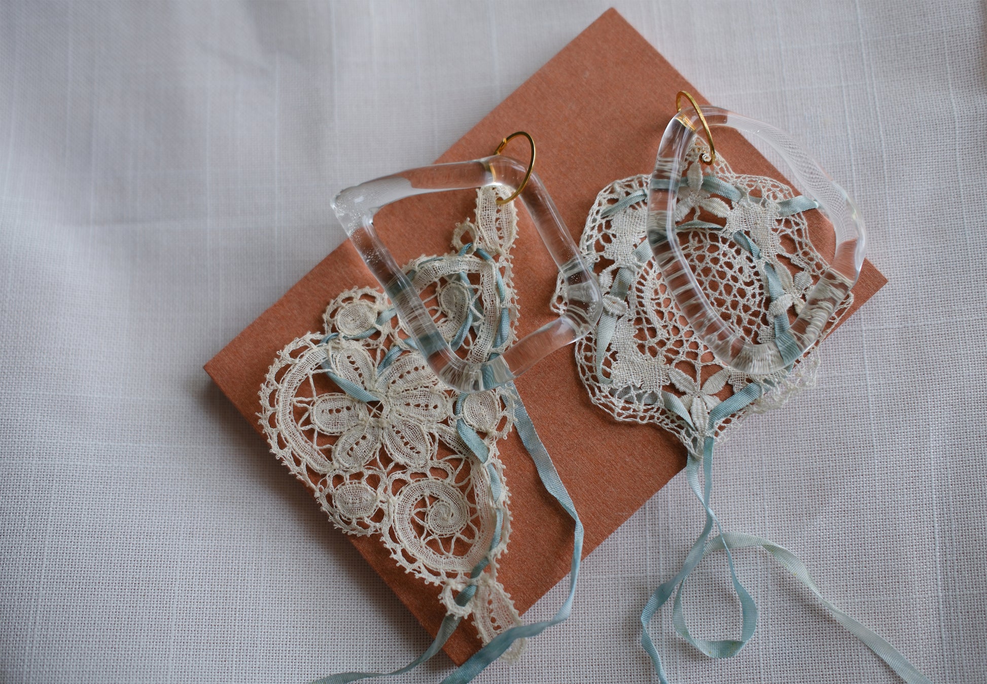 Rare victorian laces with artisan made hand glass blown abstract sculptures on gold vermeil over sterling silver hoops. Demi Bespoke.