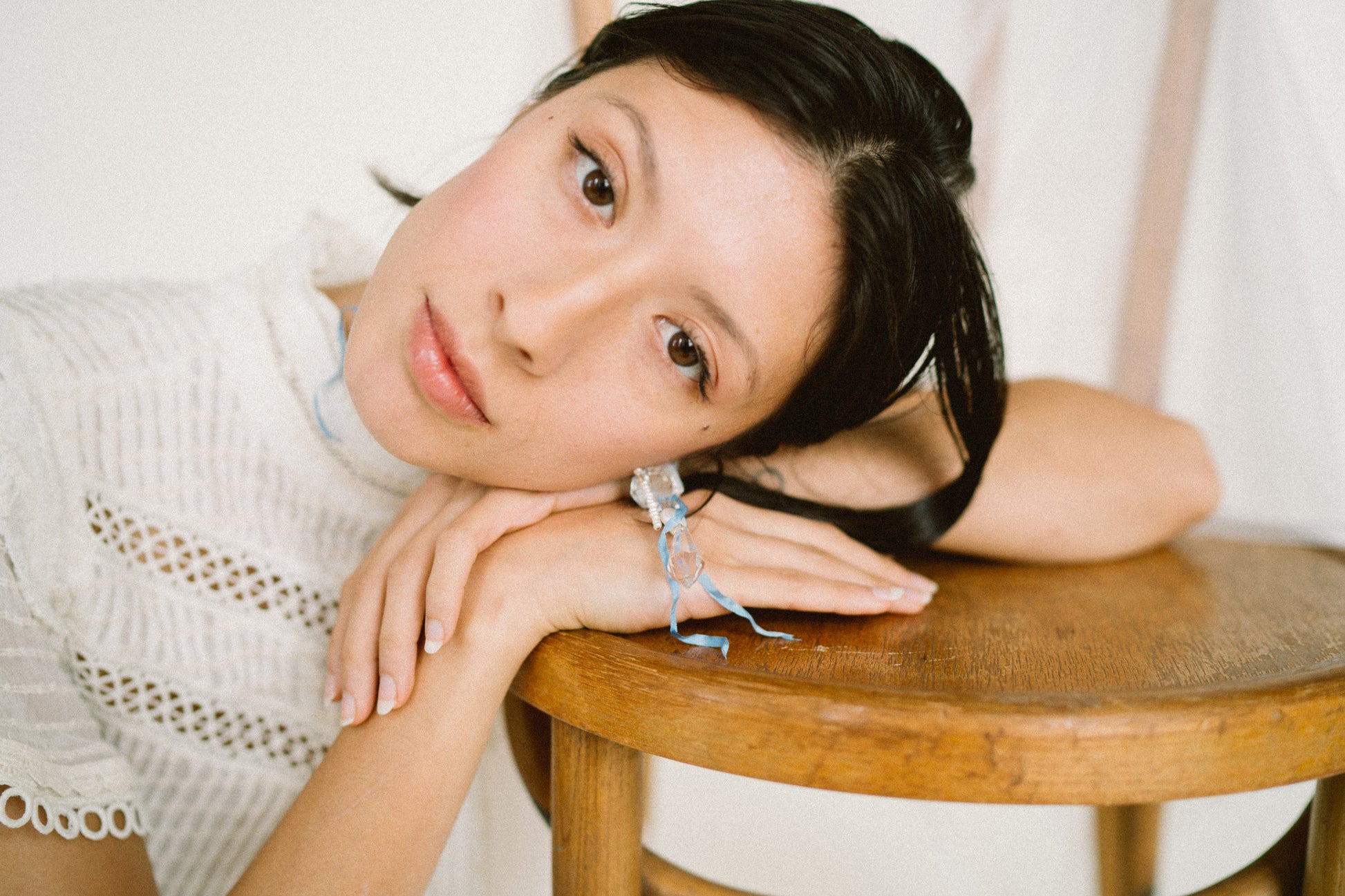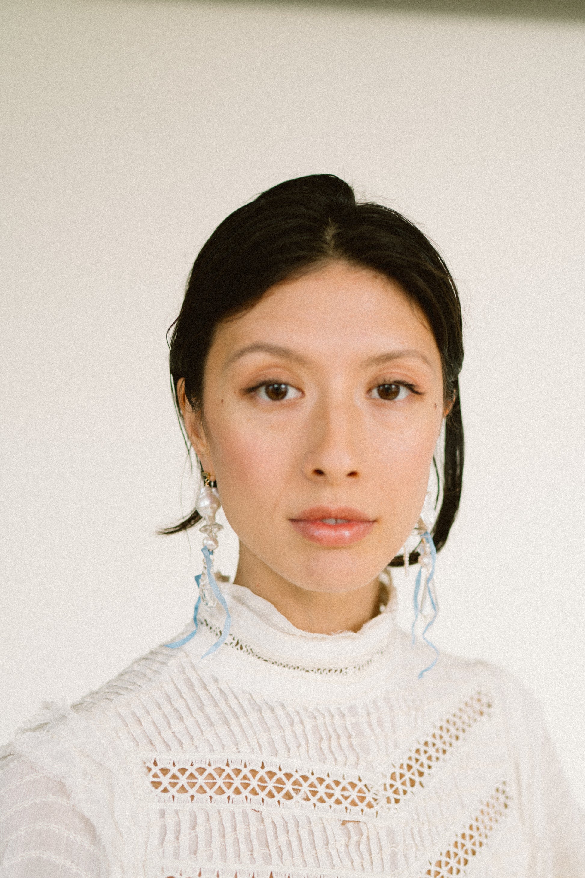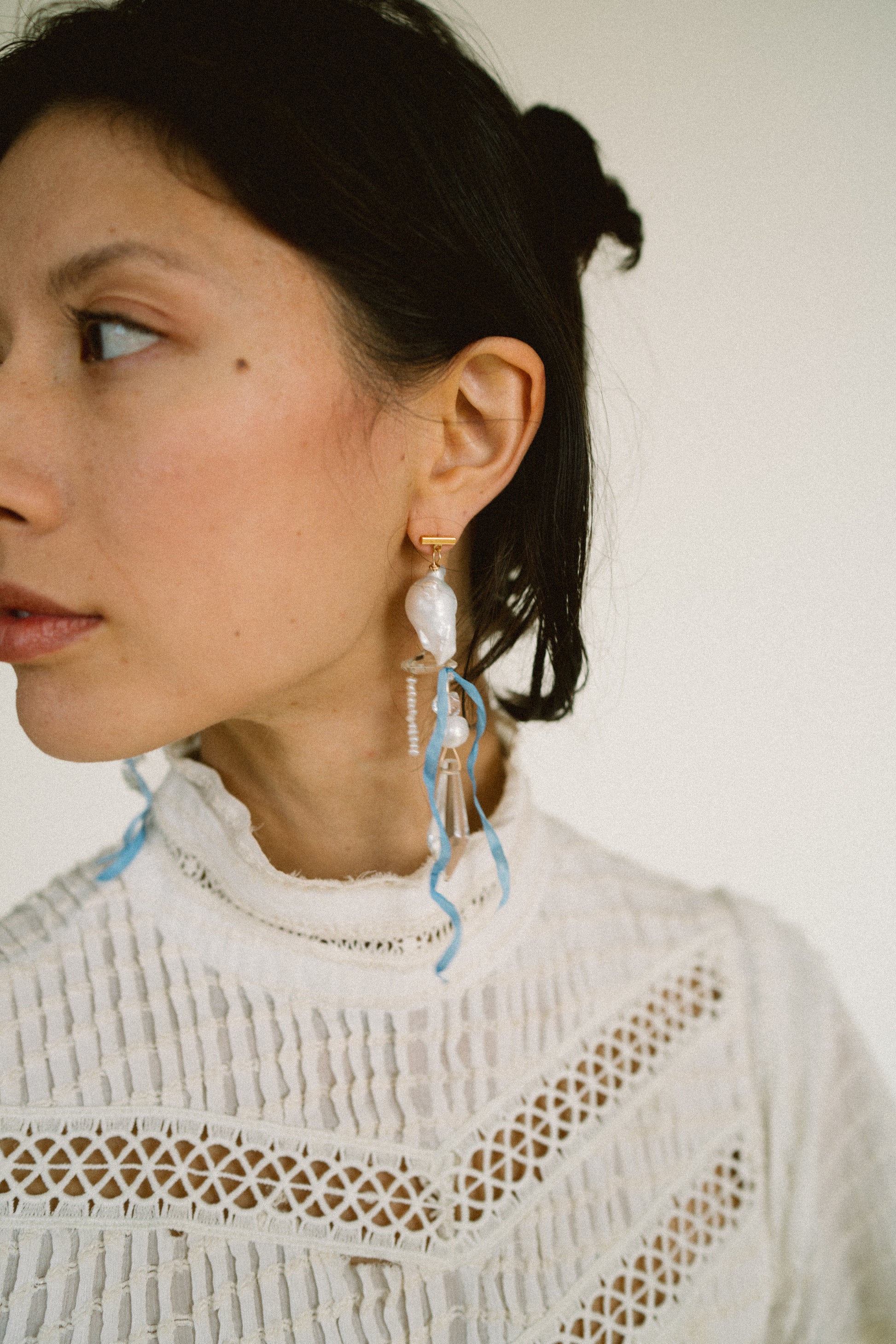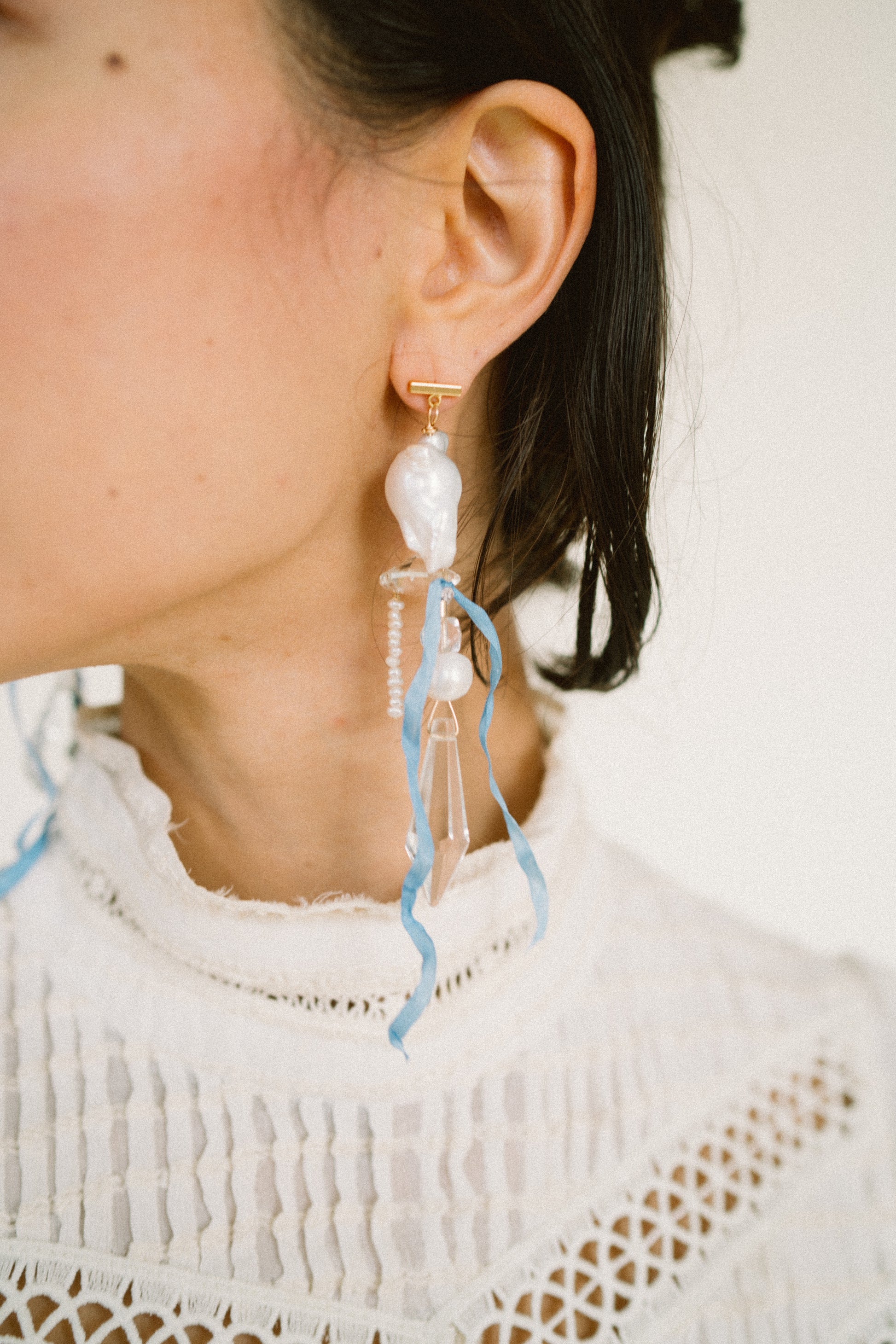made with luxury materials. 2 rare lustrous baroque pearls on gold hold sparkling crystal and freshwater pearl softly wrapped in indulgent blue silken ribbon.
