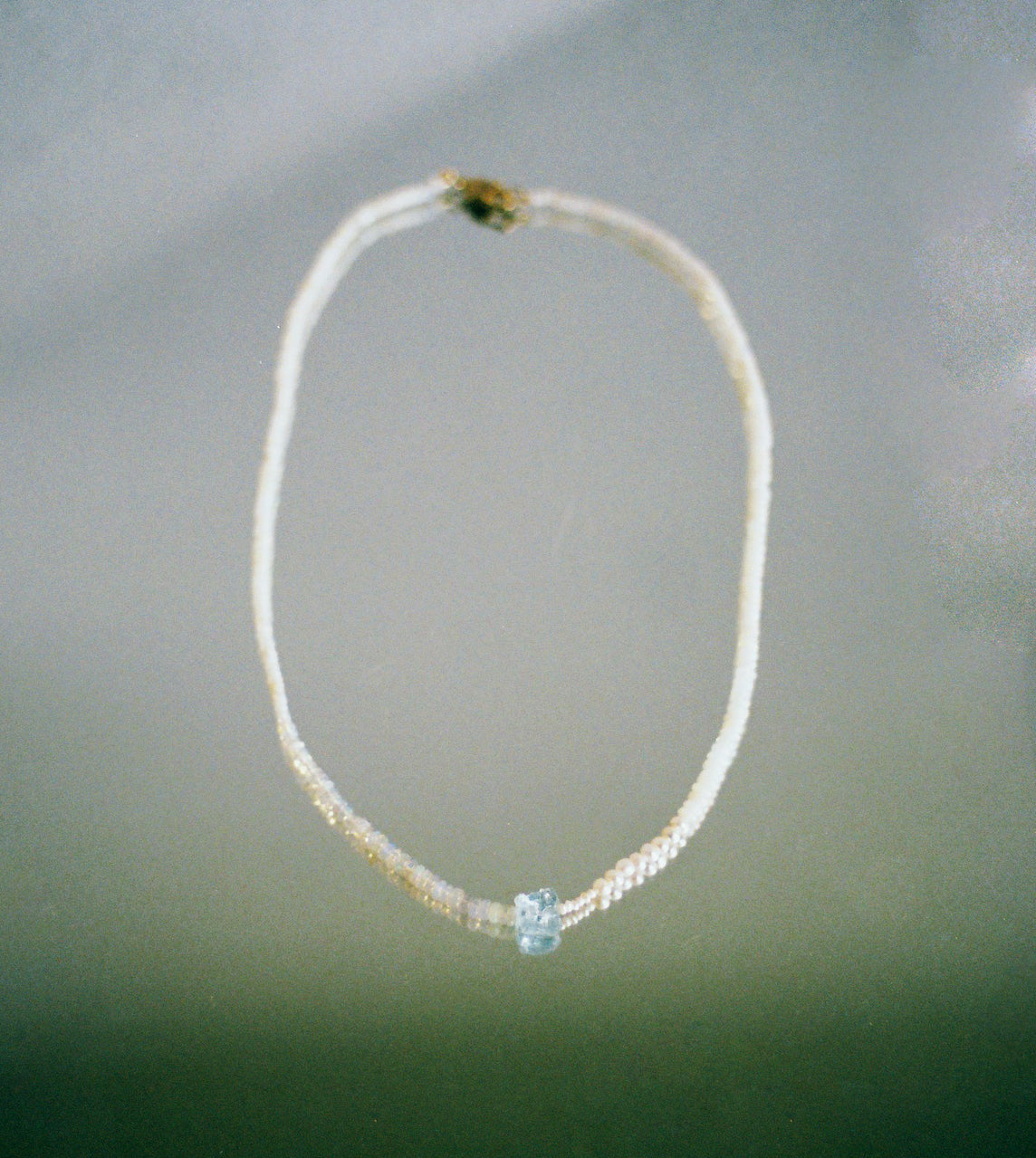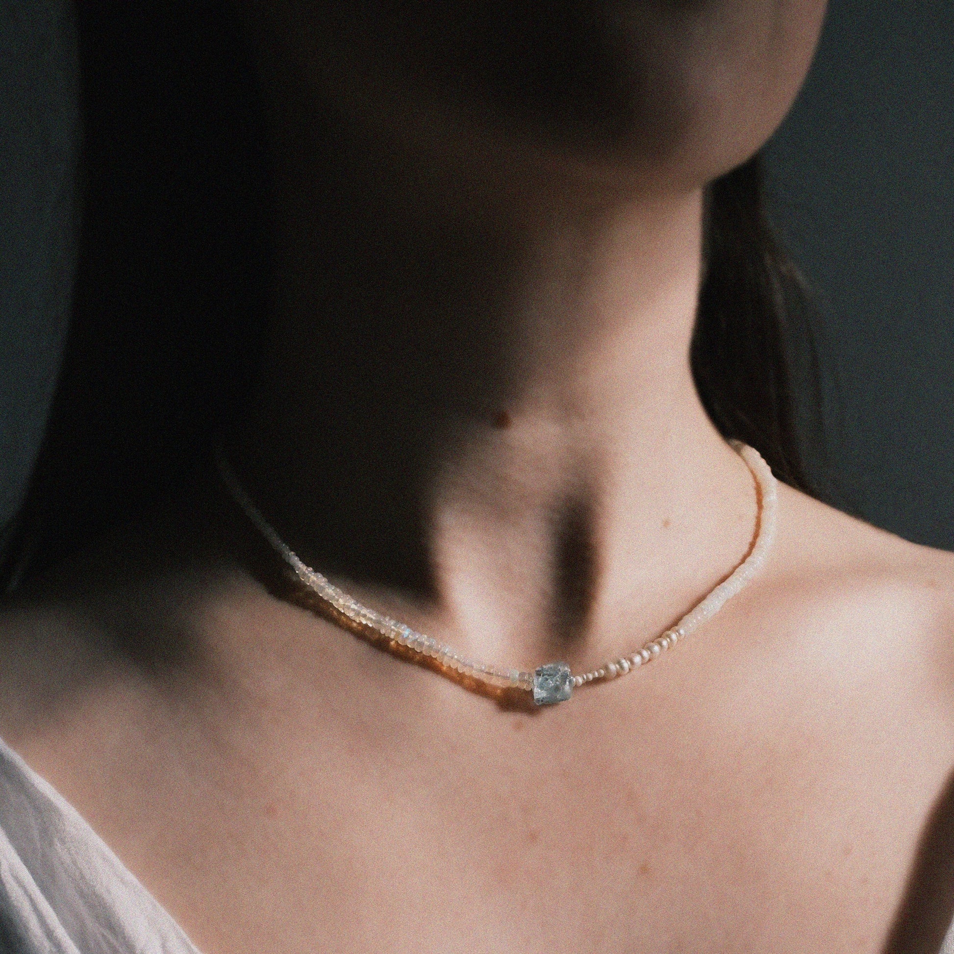 It is an ancient belief that opals came from heaven and acquired their play of color from lightning. Taylor is a striking melody of genuine Ethiopian opals, freshwater pearls and natural aquamarine on silk.