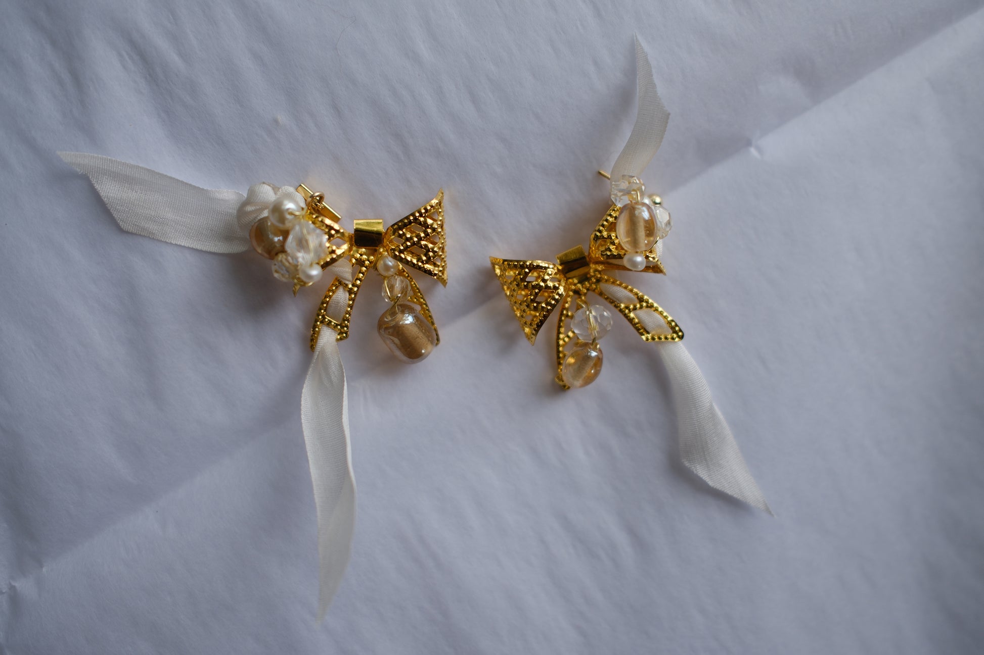 White silk ribbon wings embroidered through gold filagree metal bows and adorned with murano glass, vintage genuine crystal and pearl on gold plated stud earring posts.